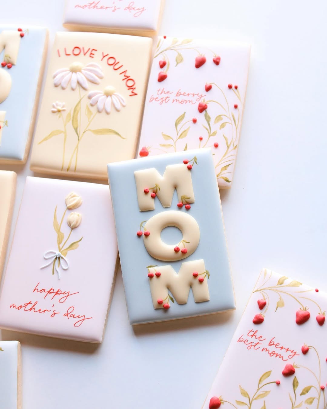 Subtle pastels and dainty florals give this cookie set a calm, graceful tone—like a handwritten note in sugar form. Embossed daisies, tulips, and vines are paired with thoughtful lettering and tiny red berries that add just the right pop. The standout “MOM” cookie uses 3D elements for a playful lift, without overwhelming the palette. Perfect for makers who love a light touch and a little wordplay.