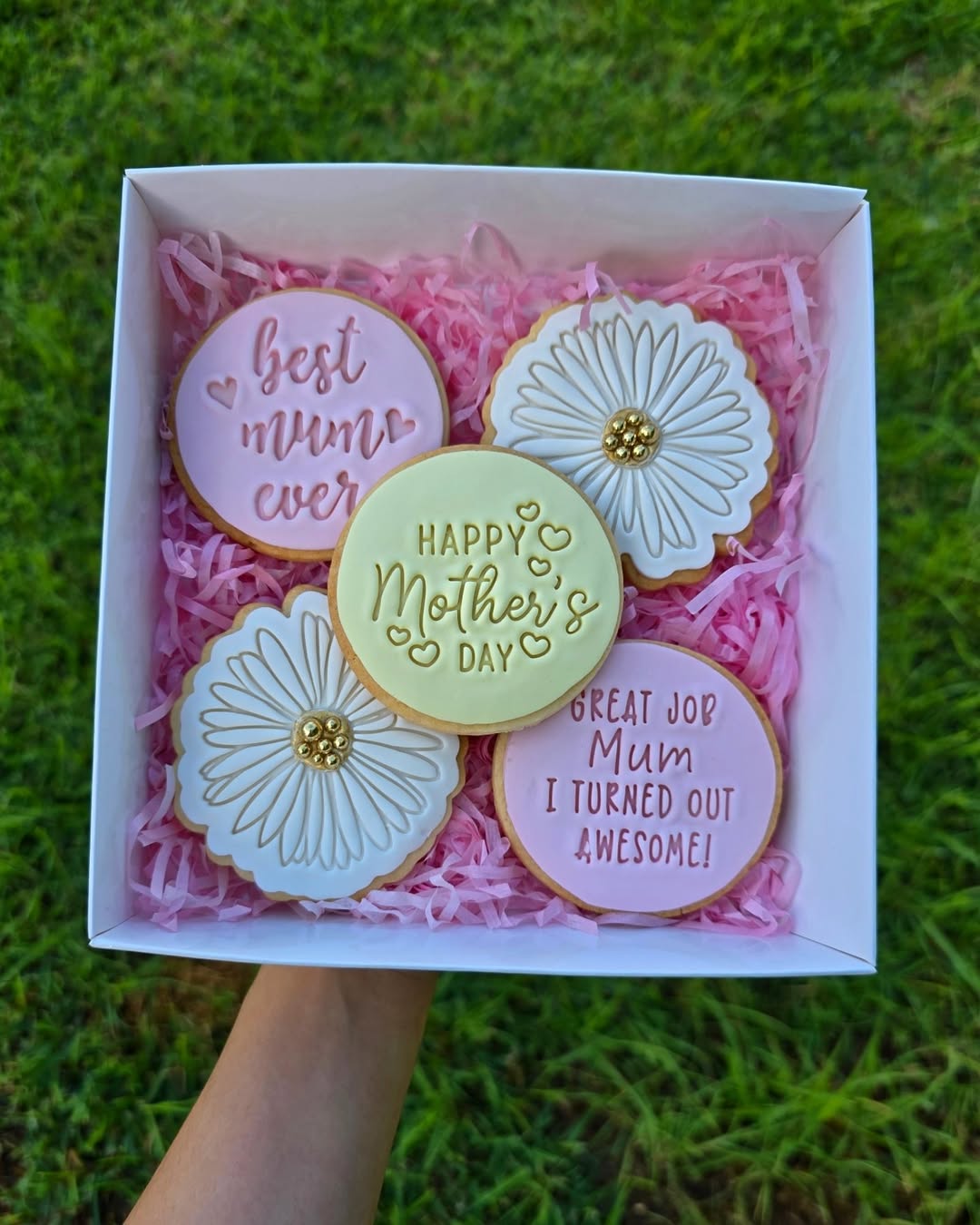 These Mother’s Day cookies nail the sweet-and-sassy brief. Soft pink fondant, gold lettering, and embossed florals make them feel luxe, while the playful quotes (“I turned out awesome!”) give them mass appeal. The daisy design, with its piped petals and golden center, adds just enough texture to stand out in a gift box. Perfect for home bakers looking to balance heartfelt and humorous—because Mum deserves both.