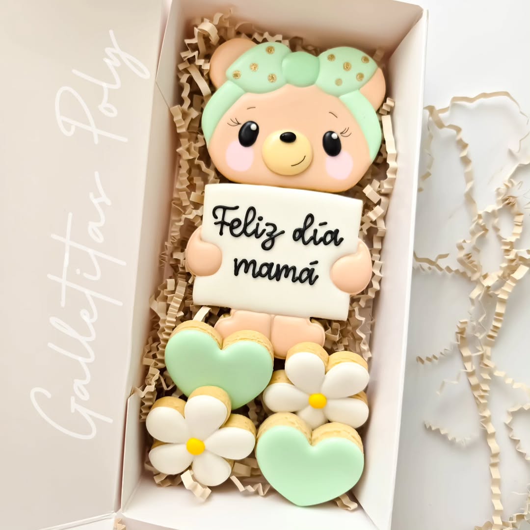 An adorable cookie bear steals the spotlight, holding a fondant sign that reads “Feliz Día Mamá” in bold black script. Mint-green hearts and daisy accents add a fresh, cheerful vibe, while soft pastel tones keep things playful and gift-ready. The layered cookie design gives it a 3D pop, making it perfect for kid-friendly Mother’s Day gifting that’s as fun to look at as it is to eat.