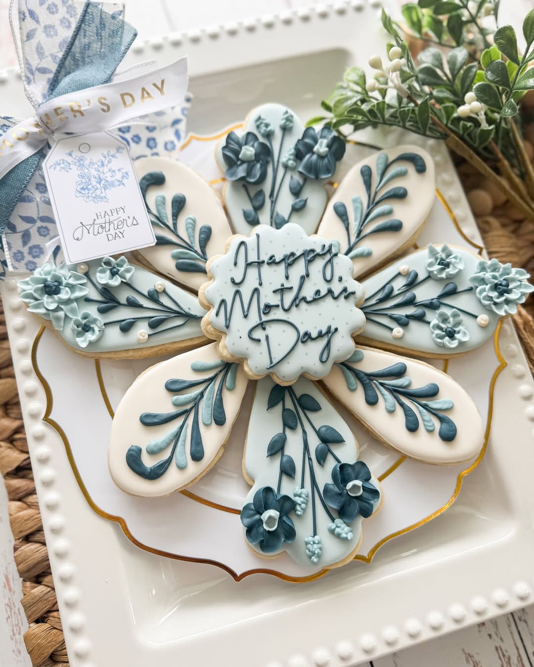 Petal-shaped cookies fan out into a full bloom, each one frosted with deep blue florals and intricate leafy piping. The center cookie carries the message in elegant script, tying the whole “bouquet” together like a showstopping centerpiece. Cool-toned pastels and sculpted flowers give it a sophisticated, almost ceramic look. Perfect for sellers offering upscale, platter-ready Mother’s Day treats.