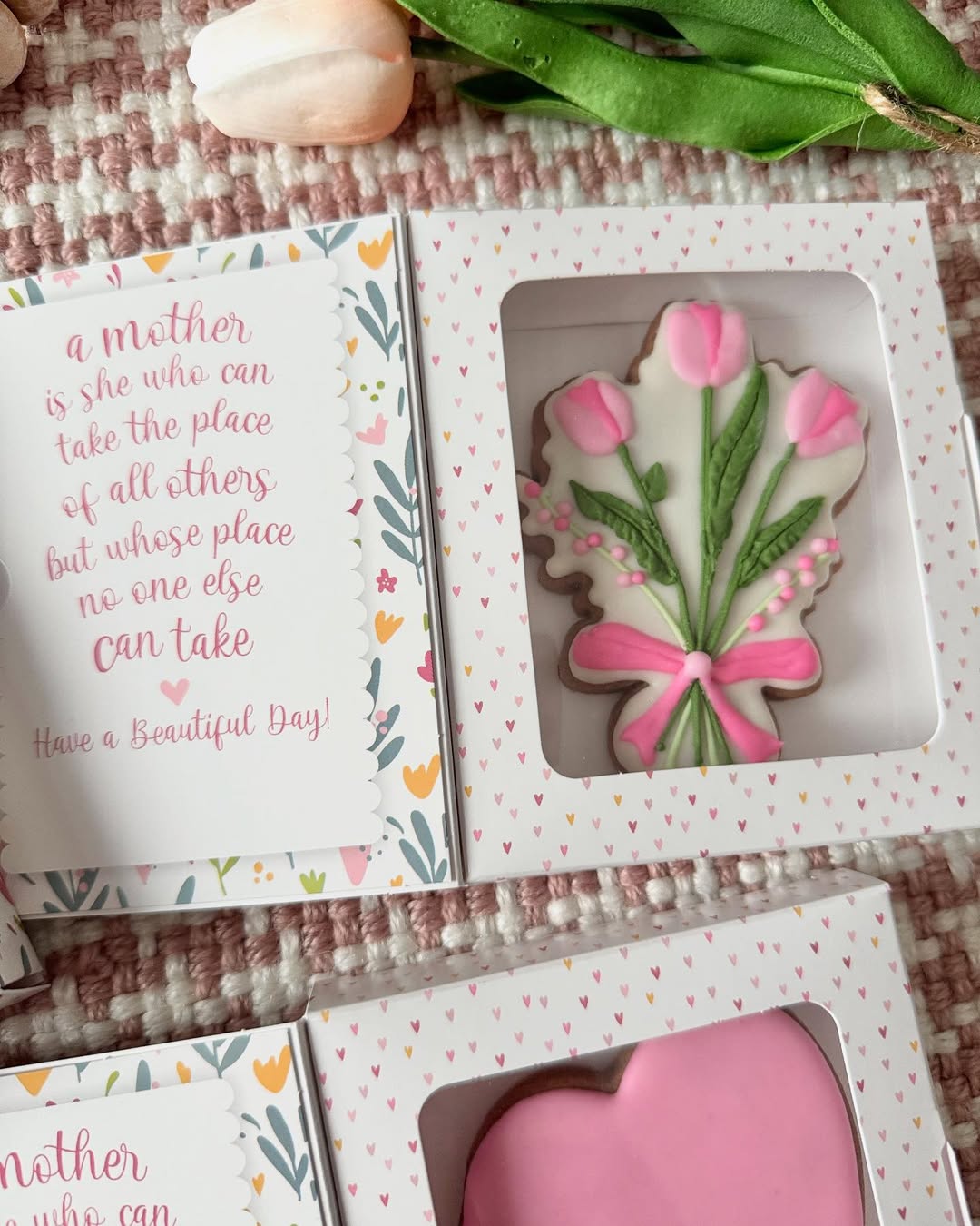 Each cookie comes tucked in a floral-patterned box, paired with a heartfelt quote that reads more like a keepsake than just a treat. Hand-piped tulips and ombré hearts peek through the window for an elegant first impression. The design is simple, but the presentation does all the heavy lifting. Great for sellers focused on thoughtful, ready-to-gift options that feel as meaningful as they are sweet.