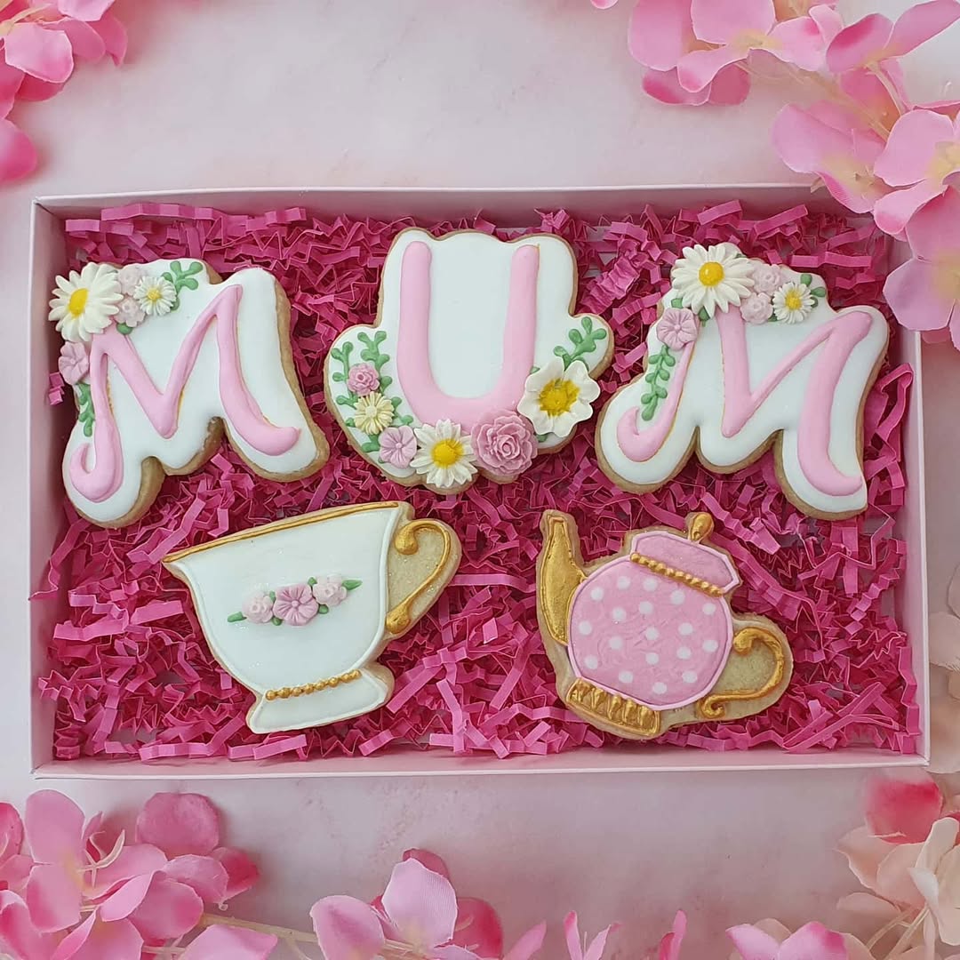 Fondant florals and pastel pinks give these “MUM” cookies an unmistakably vintage charm. Each letter is decked out like a mini garden, with piped daisies, roses, and vines bringing the spring vibes. The matching teacup and teapot cookies? Utterly delightful—and dipped in just enough gold to feel special. Perfect for high tea in biscuit form, no RSVP required.