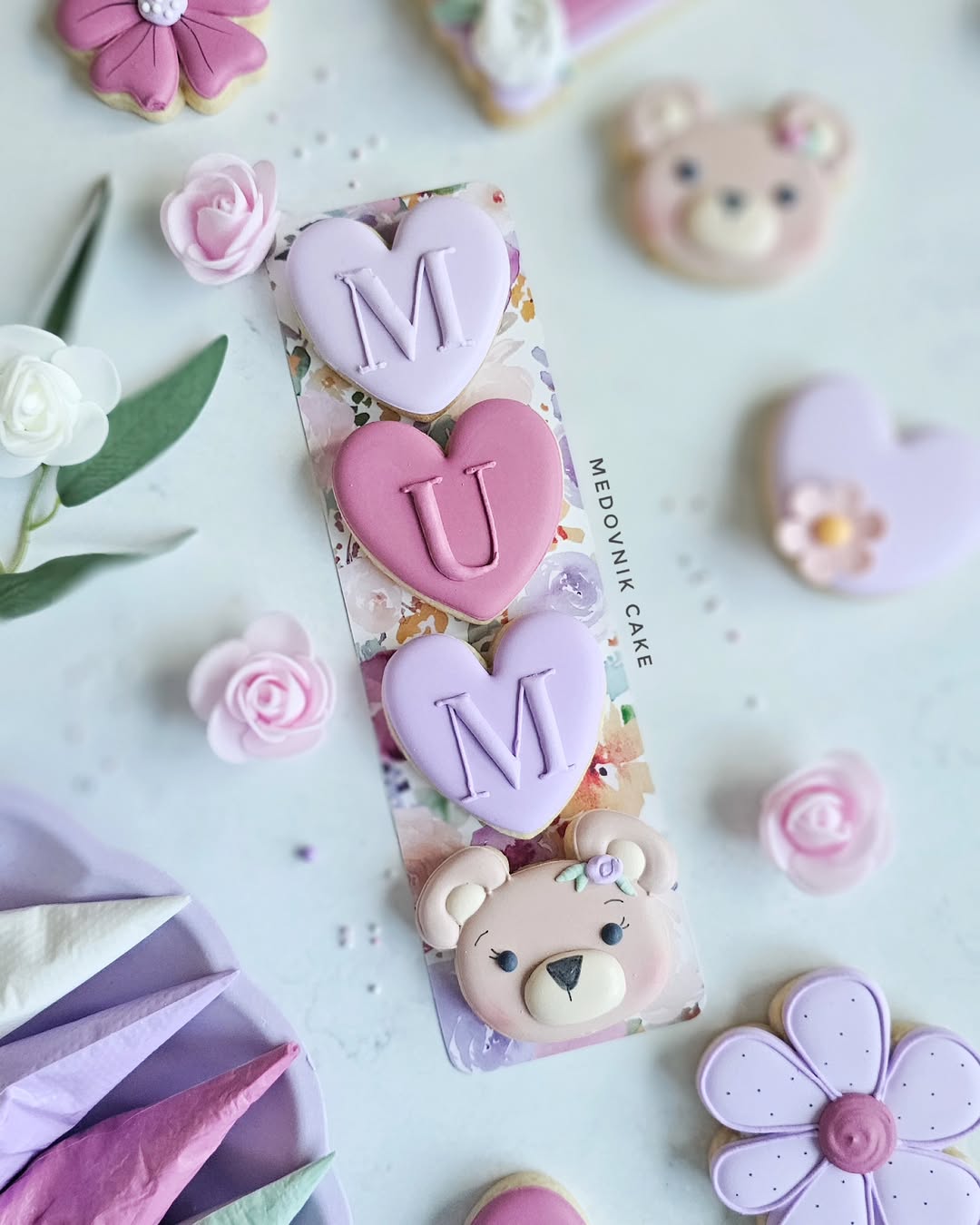 Three heart cookies spell out “MUM” in soft lilac and rose tones, keeping things sweet and simple. The real scene-stealer? That adorable fondant bear with blush cheeks and a floral headband—basically a cookie-sized cuddle. Clean piping and playful packaging make this set feel personal without going over the top. A great pick for kids or anyone wanting to say “I love you” without saying a word.