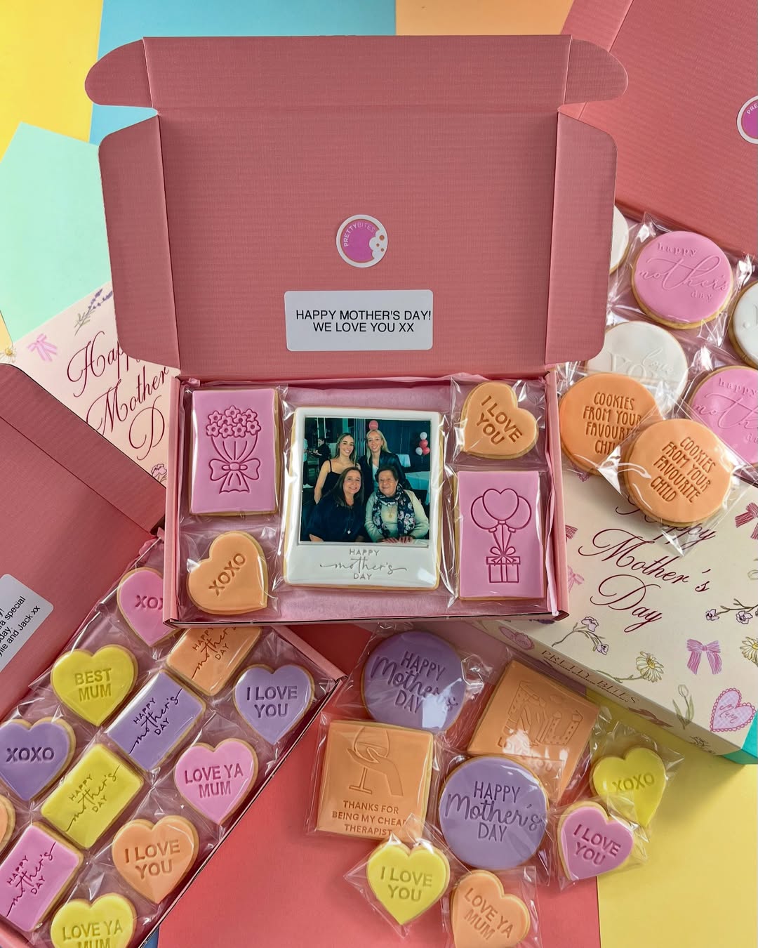 Photo cookies take center stage here, turning personal memories into sweet, frame-worthy treats. Soft pastel florals and simple heart shapes balance out the design, giving the box a clean, modern feel. Each cookie is labeled with a handwritten-style message, adding to the sentimental, scrapbook-like vibe. Perfect for sellers offering custom orders—this one’s all about the feels.