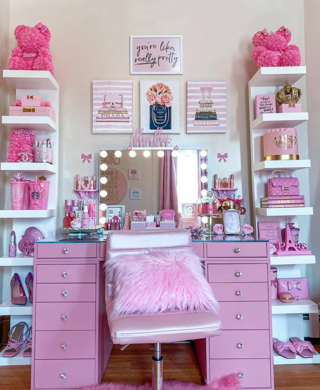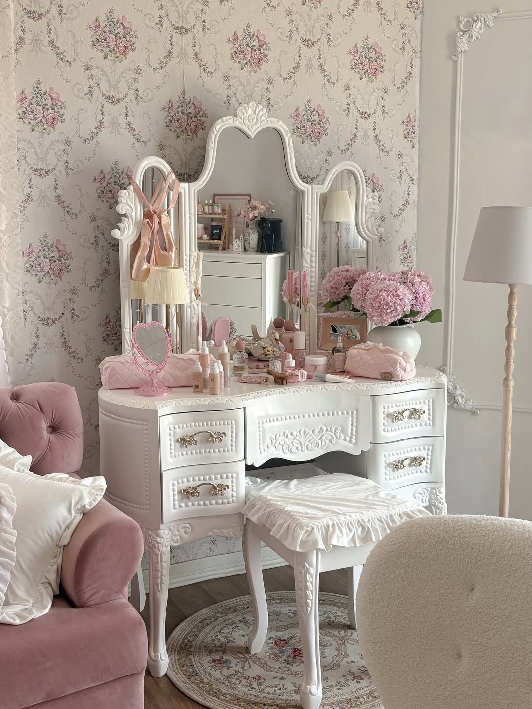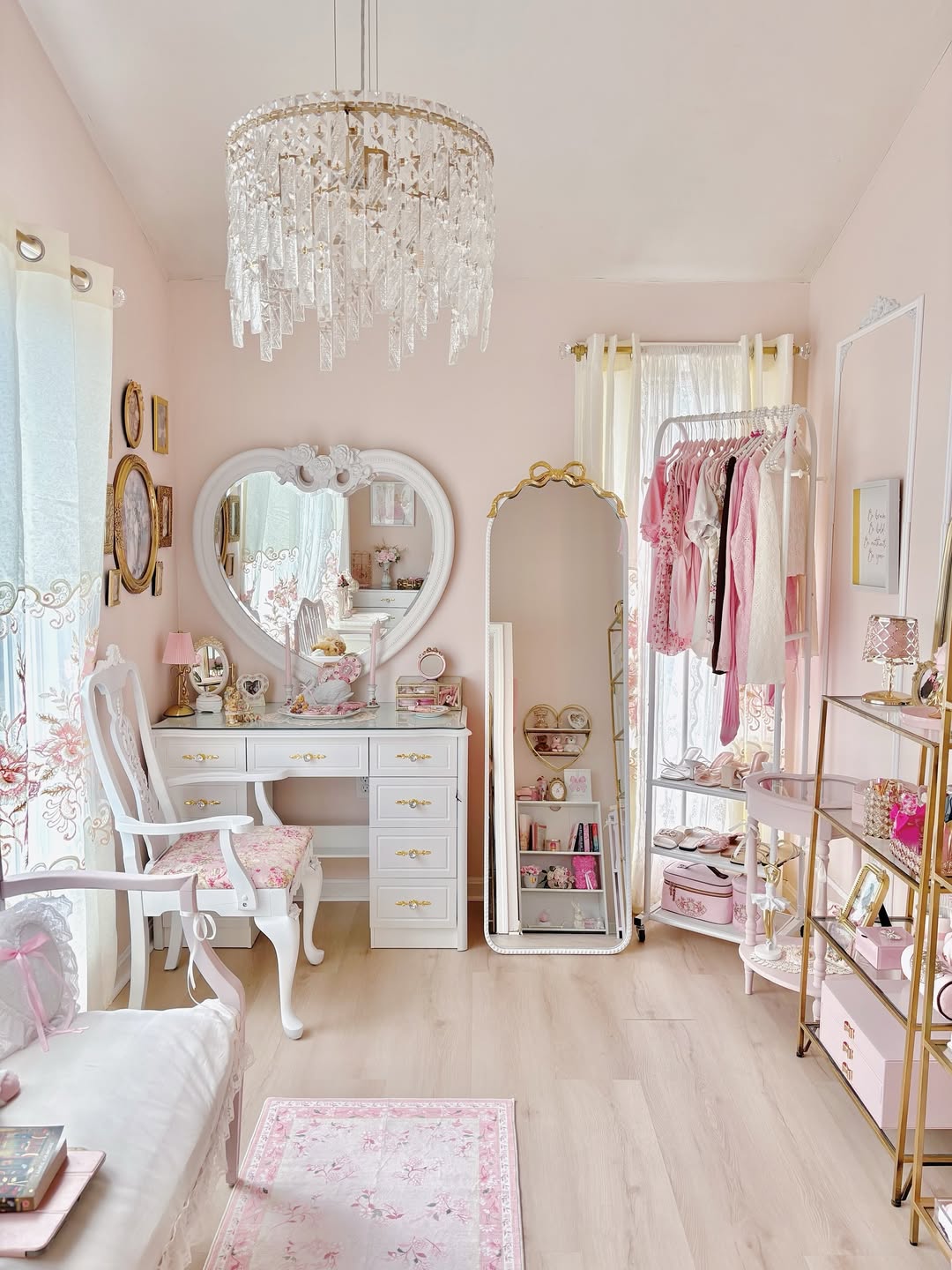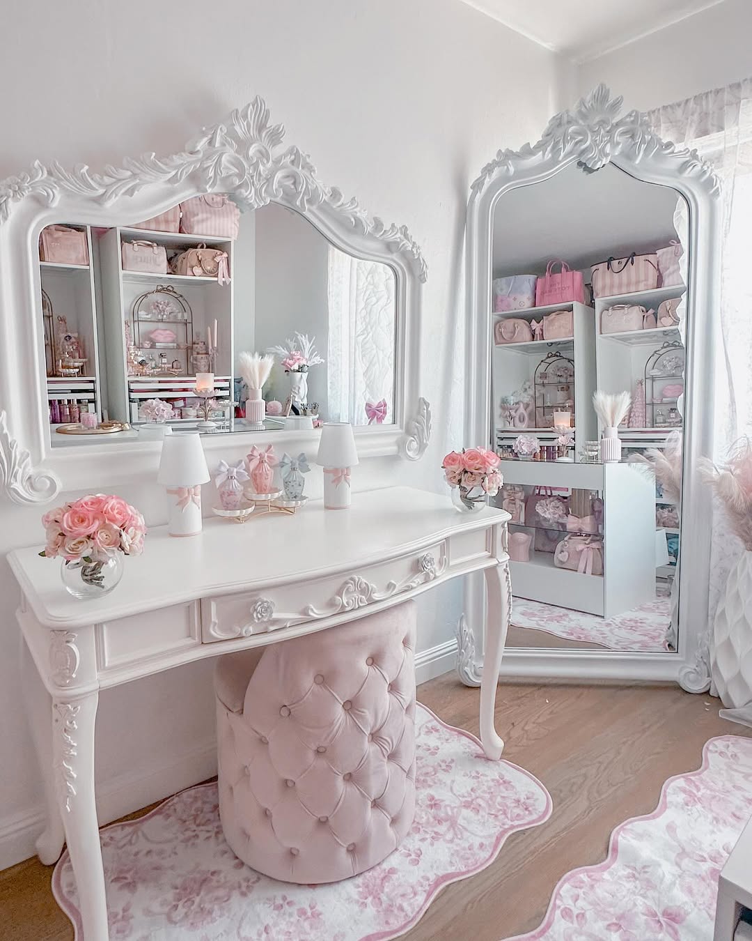 Think blush tones, ruffled textures, ornate frames, and charming storage pieces that make even your makeup routine feel like a ritual. It’s not just a room; it’s an experience.