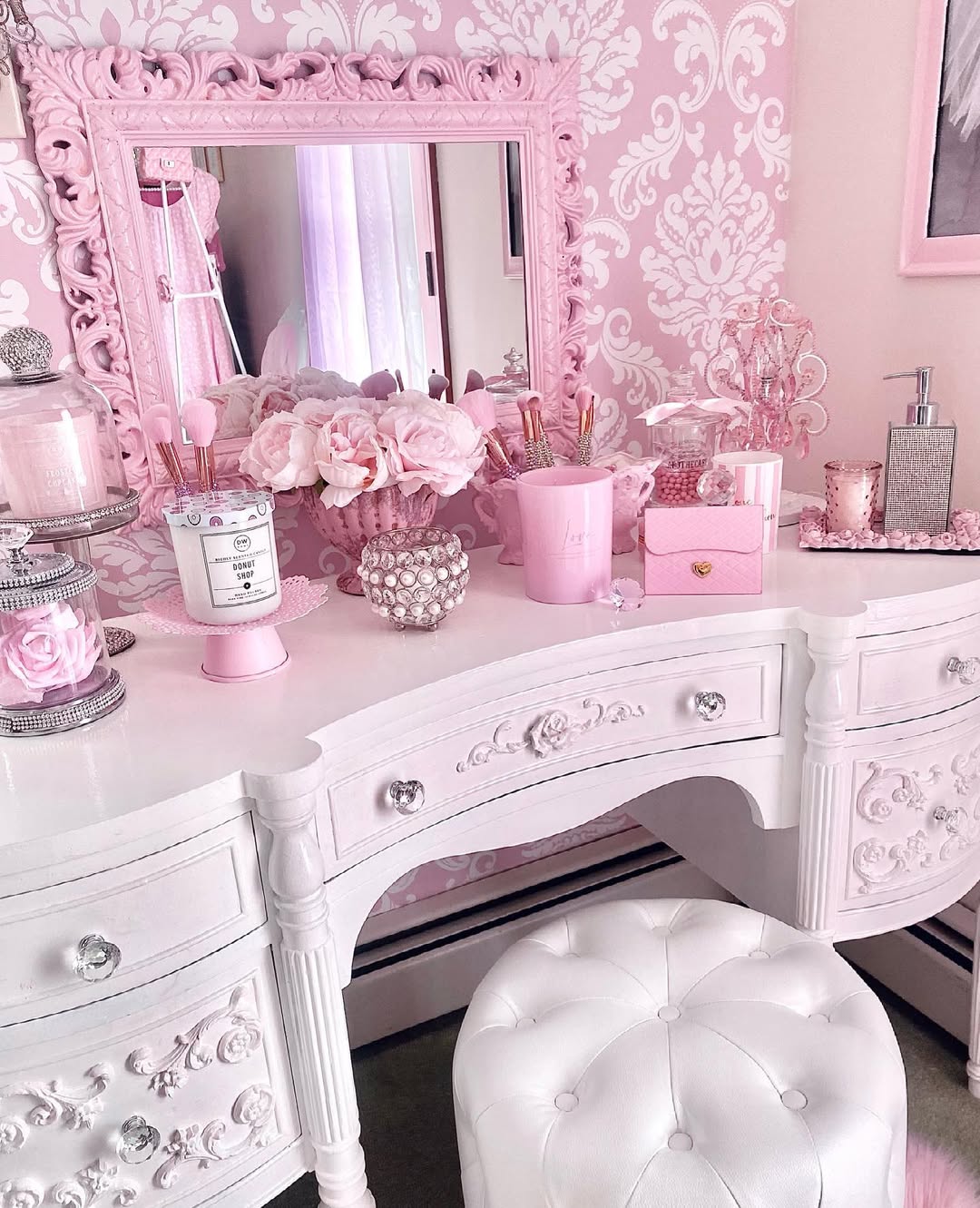 A: It combines soft pink tones, vintage-inspired accents, and romantic details to create a feminine, glamorous atmosphere. Think tufted chairs, ornate mirrors, lace or ruffled textiles, and delicate lighting that make the room feel like an elegant dressing space.