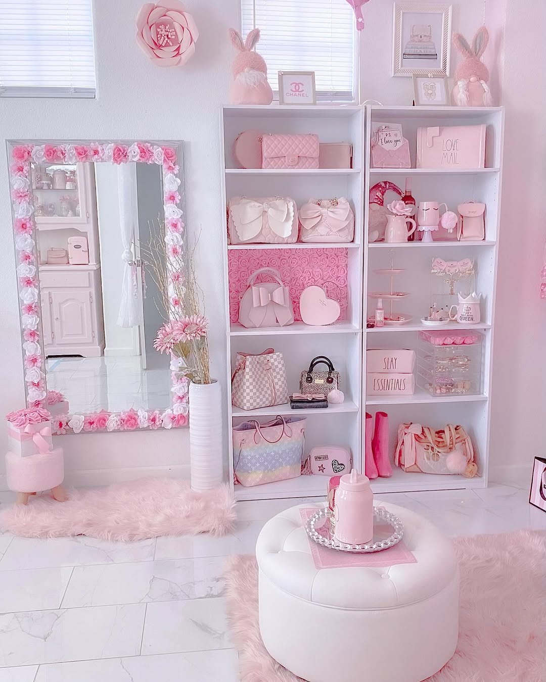 Cuteness meets curation in a space that feels like a kawaii boutique. Rose-lined mirrors, bunny-eared plushies, and bow-shaped bags are styled like collectibles. White floors and soft pink fur accents keep everything looking airy and clean. Just enough sparkle without feeling overstuffed.
