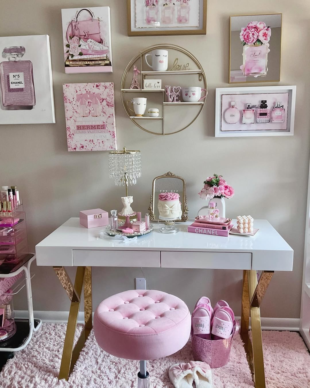A glam desk doesn’t stop at the tabletop. Beauty-themed prints and shelves of pastel mugs turn the wall into a gallery of soft luxury. Golden desk legs echo the framed art above, while tufted pink slippers tuck under for extra cozy points. Feels like Chanel met Pinterest and moved in together.