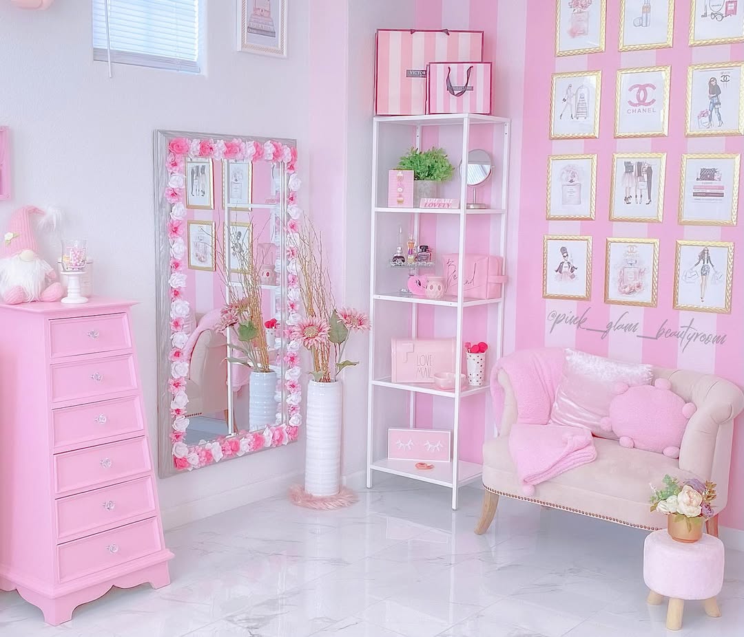 Striped walls and framed fashion sketches bring serious boutique energy. A tufted loveseat and furry throw make the space lounge-worthy, while the petal-trimmed mirror adds softness in just the right place. Every shelf and drawer plays its part in the pink story without feeling too matchy.