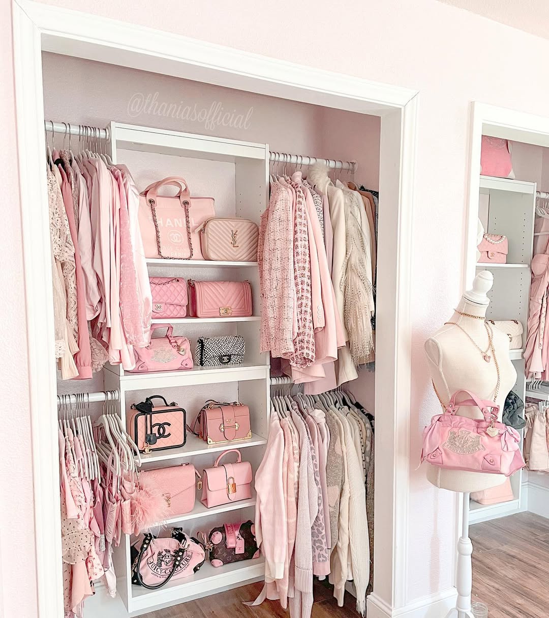 Coordinated bags, blazers, and bouclé jackets turn this closet into a pastel showroom. Each rail feels intentional, with accessories styled like display pieces. A dress form topped with a statement bag adds a boutique twist. Who needs doors when the wardrobe’s this pretty?