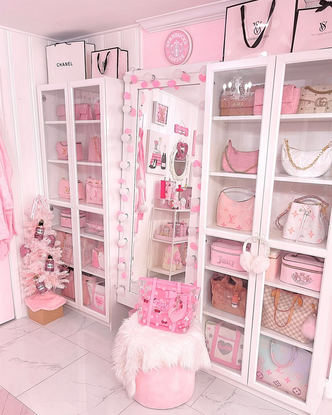 Rows of Louis, Juicy, and Barbie bags get the VIP treatment behind glass-front cabinets. A pom-pom mirror lights up the corner like a selfie station, while fluffy textures soften the glossy finishes. Even the mini Christmas tree sticks to the pink theme—proof that holiday spirit and handbag goals can absolutely coexist.