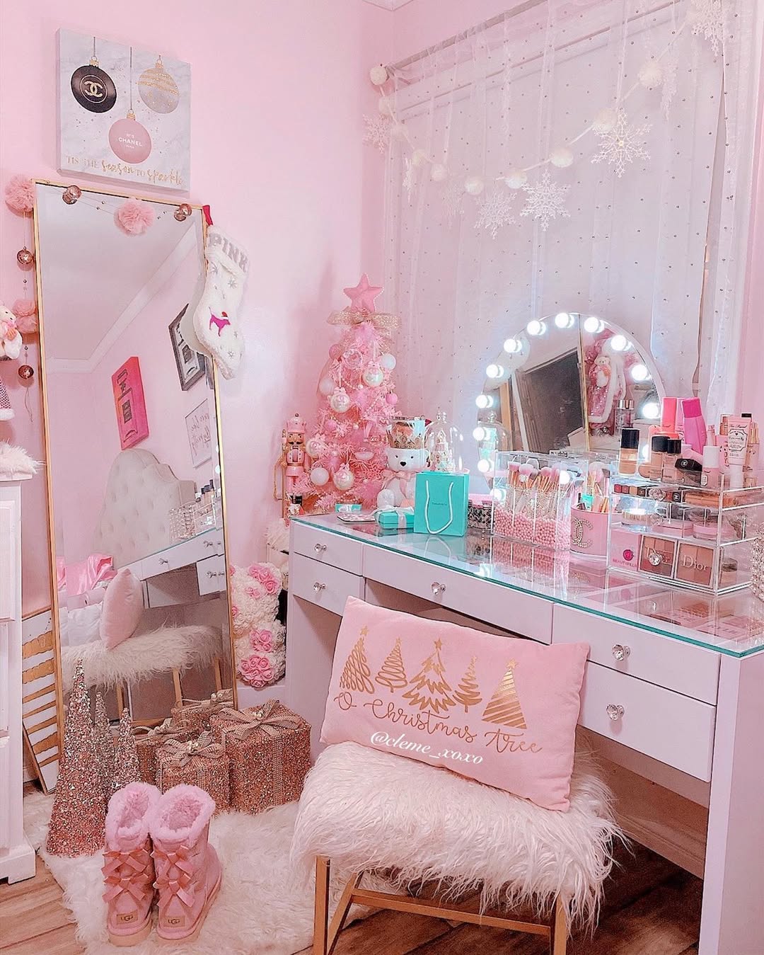 It’s called coquette, but make it Christmas. From the blush-toned tree to the glitter-wrapped gifts, this vanity corner leans all the way into pink-on-pink glam. The mirrored surface and acrylic organizers keep it sleek, balancing out the fluffy textures and plush finishes. Even the UGGs match the palette—because why not get ready like you’re starring in your own holiday rom-com?