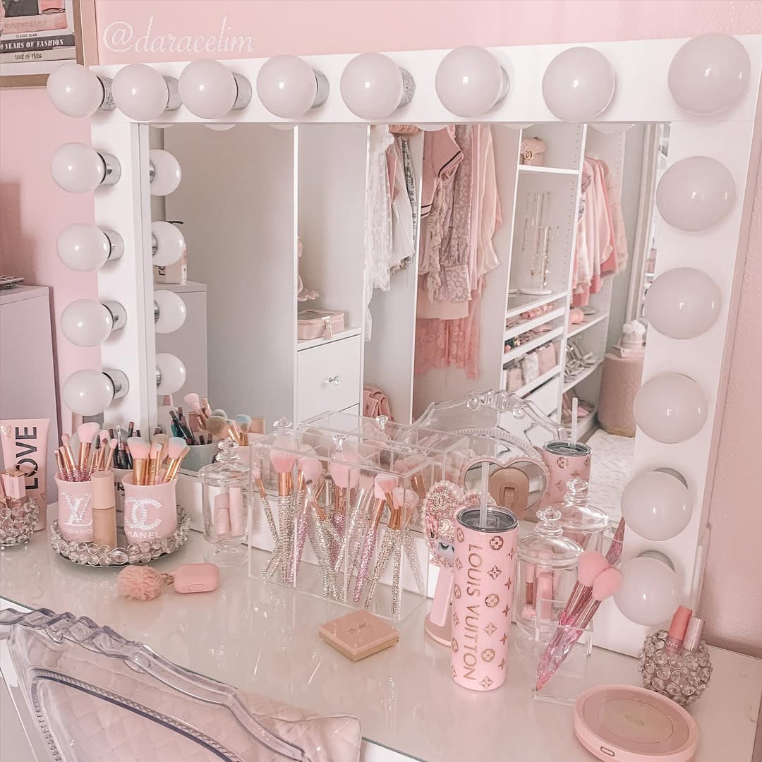 A crystal-clear organizer keeps every tool visible and every lip gloss in check. Glittery brush handles double as decor, while oversized bulbs create a Hollywood glow. Closet reflections in the mirror add depth—and a peek at the rest of the pink fantasy. Who says practical can’t be pretty?