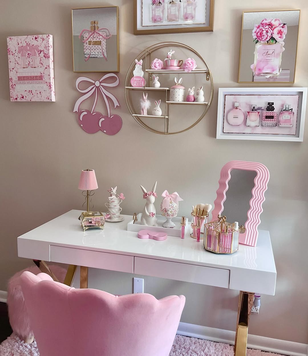 Soft pink accents and Easter-inspired figurines give this glam setup a playful edge. A ripple mirror, cherry wall art, and gold round shelf add layers of shape and charm. Scalloped chair detailing keeps the mood sweet, while lipstick holders double as decor. Everything’s placed with intention—even the cuteness.