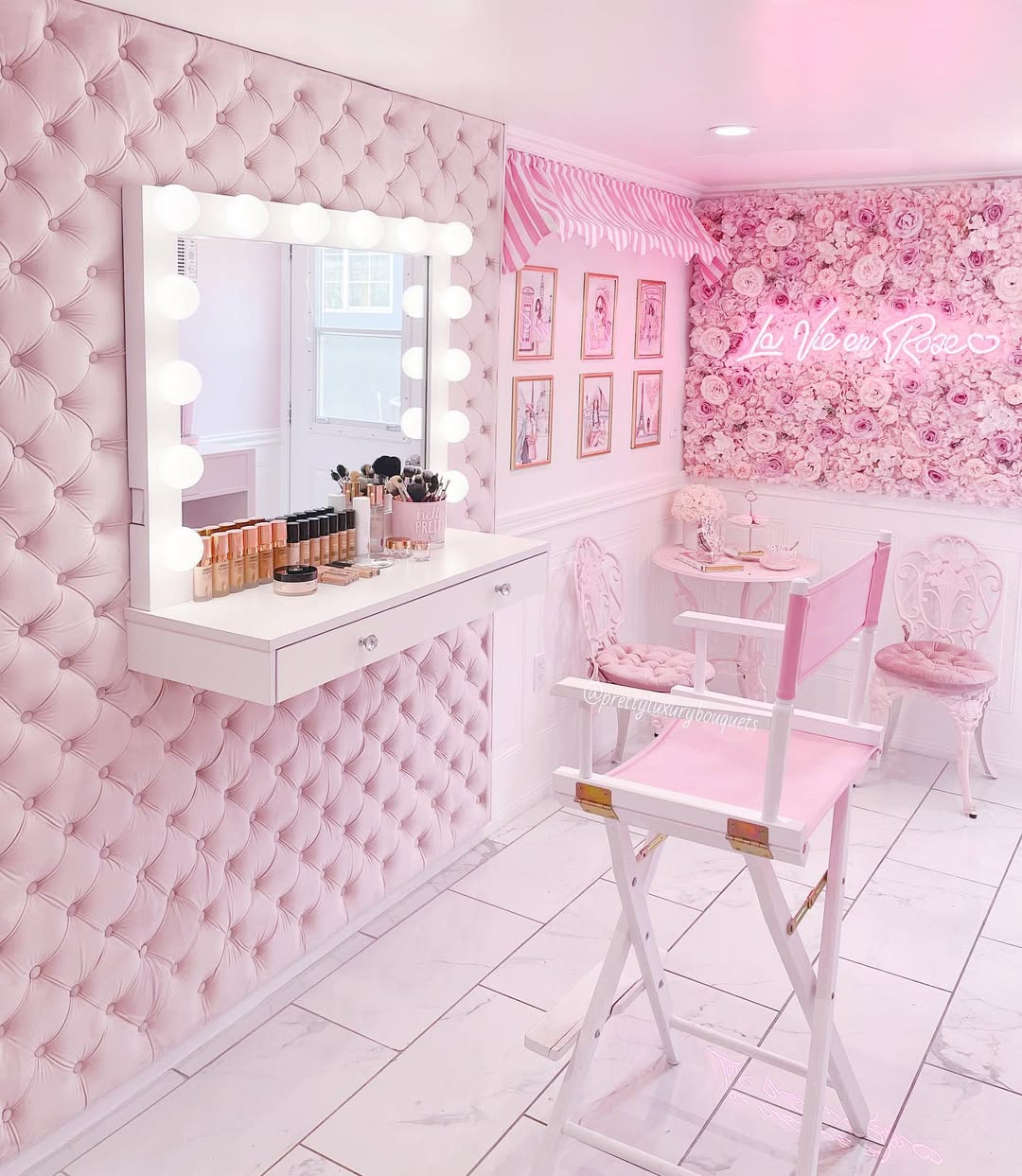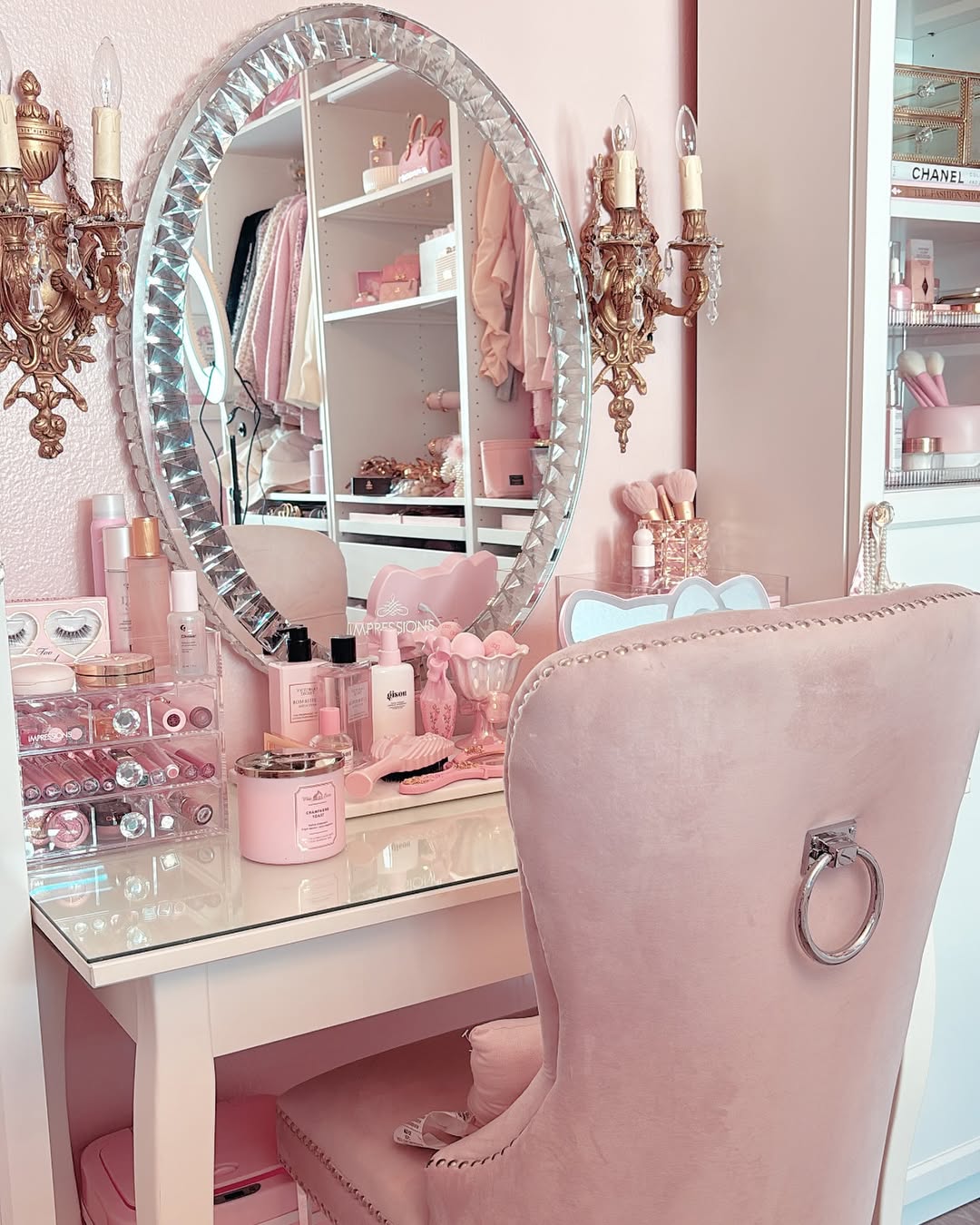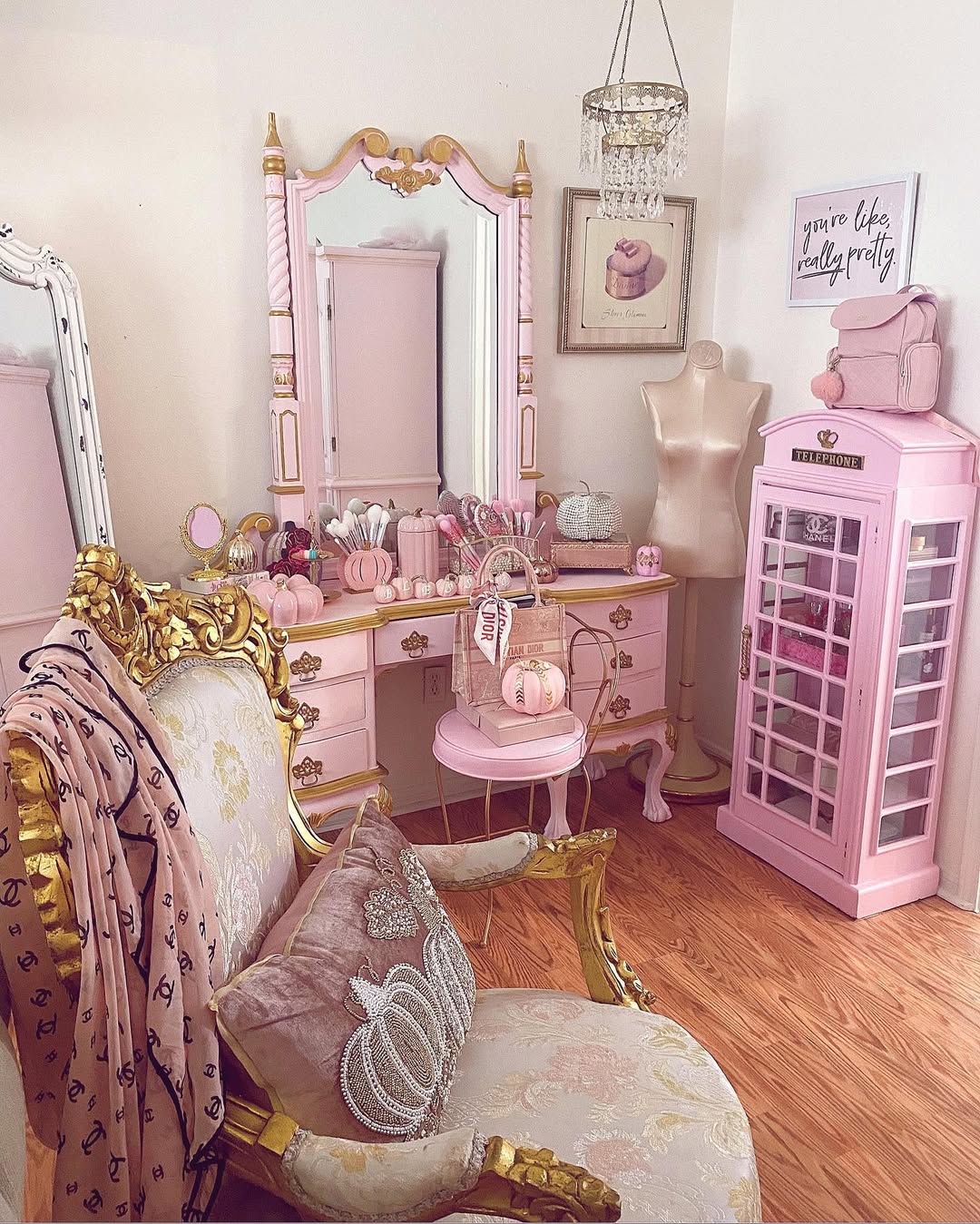 This one’s serving Versailles, but make it blush. Ornate gold trim and brocade upholstery give the vanity corner a regal twist, while the Chanel throw and pink rotary “phone booth” keep it playful. Every surface—from the mirror frame to the makeup brushes—leans fully into the theme. No neutrals needed when your throne is this glam.