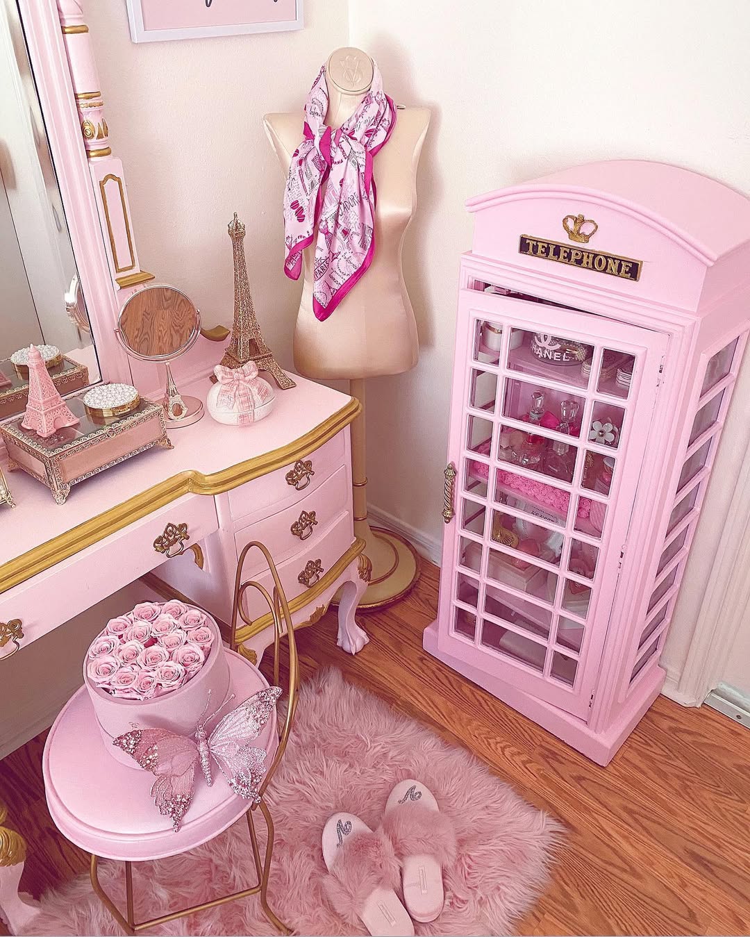 Mini Eiffel Towers, gilded trim, and a scarf-draped mannequin pull off a très chic setup. A blush pink phone booth cabinet steals the spotlight, turning perfume storage into a fashion statement. Soft textures like the fur rug and velvet roses balance the glam with a little romance. It’s giving Parisian penthouse—on pastel mode.