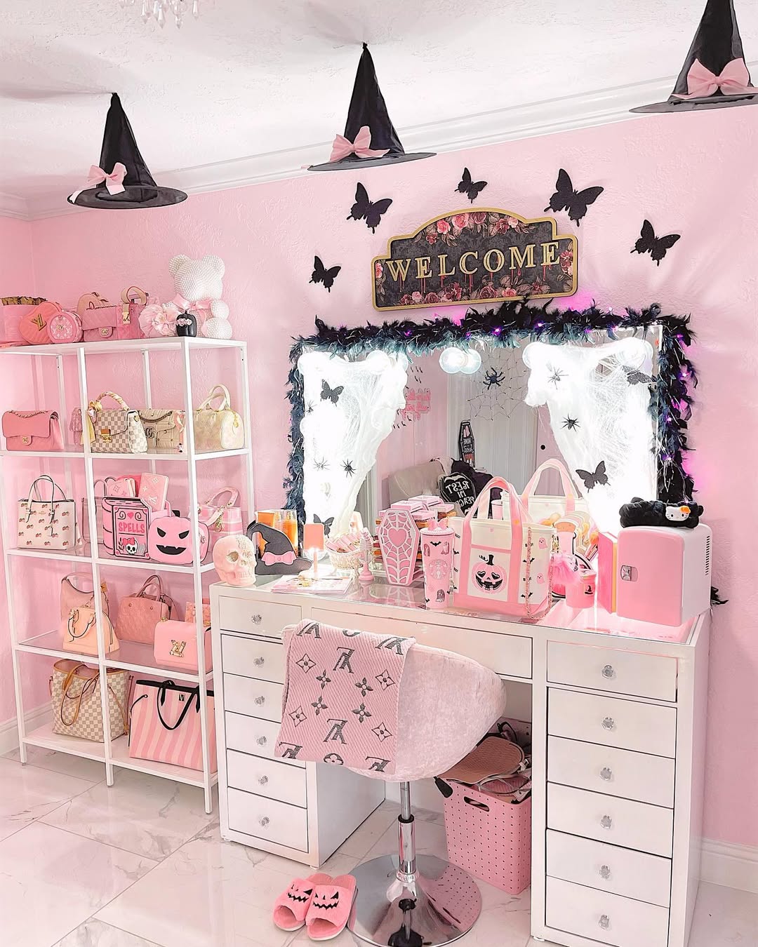Floating witch hats, cobwebs, and bats say spooky, but make it fashion. Pink pumpkins and coffin-shaped pouches blend right into a glam vanity filled with soft blush tones. Shelves lined with designer bags add luxe to the look, while slippers and a cozy blanket keep it grounded. Halloween, but coquette-core.