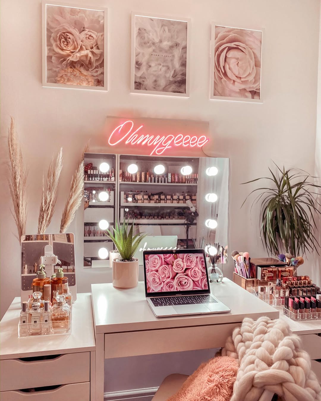Skip the florals—this vanity is all about the glow-up. The pink neon sign gives instant personality, while the lipstick racks bring pro-level organization to the glam game. Even the MacBook gets in on the aesthetic with its rosy screen. Sleek, sharp, and totally curated for your content queen era.
