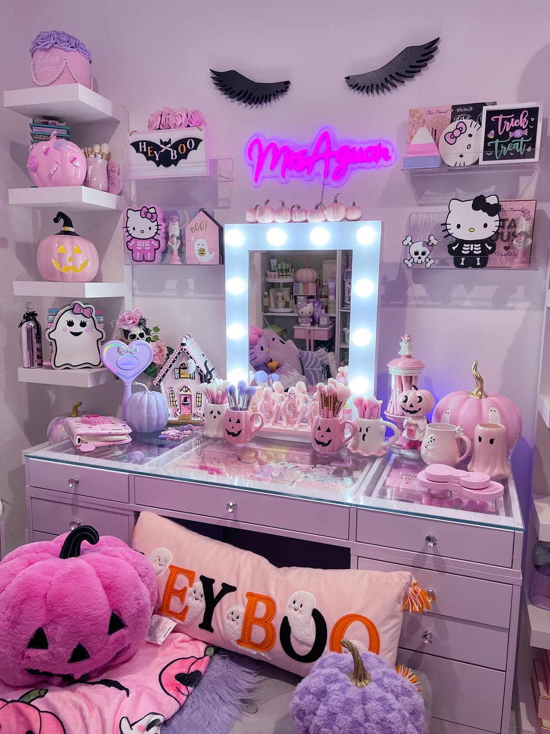 Spooky season never looked so soft. Pink jack-o’-lanterns, ghost mugs, and Hello Kitty in skeleton gear turn this vanity into a Halloween dreamland. The neon name sign and fluttery wall lashes add just the right dose of sass. Proof that you can summon spirits and slay your makeup game.