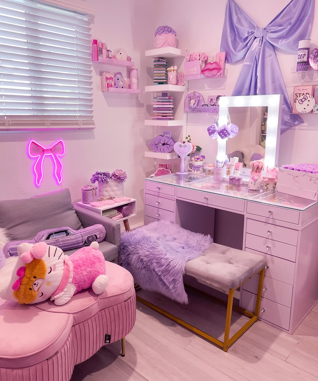 Forget minimalism—this room’s a coquette wonderland. That oversized satin bow above the mirror? Full main character moment. From the heart-shaped shelves to the plush Hello Kitty chaise, every inch of this setup is dressed to impress. Bonus points for the lavender throw that makes the glam station nap-friendly.