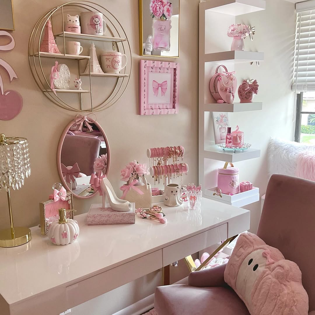 Pretty things need pretty homes, and this vanity gets it. Floating shelves hold everything from perfume bottles to porcelain poodles, while the blush chair and bow-accented mirror double down on charm. Even the jewelry display feels curated, not cluttered. It’s giving collector—not hoarder.