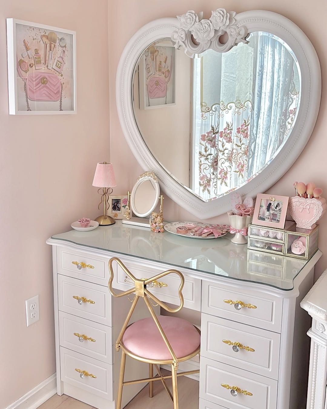 Skip the straight lines—this vanity goes full-on sweetheart. The oversized heart mirror steals the spotlight while the gold bow-back chair adds a sculptural twist. Soft pinks and delicate gold handles keep it playful, not precious. Bonus: even the wall art matches the makeup mood.
