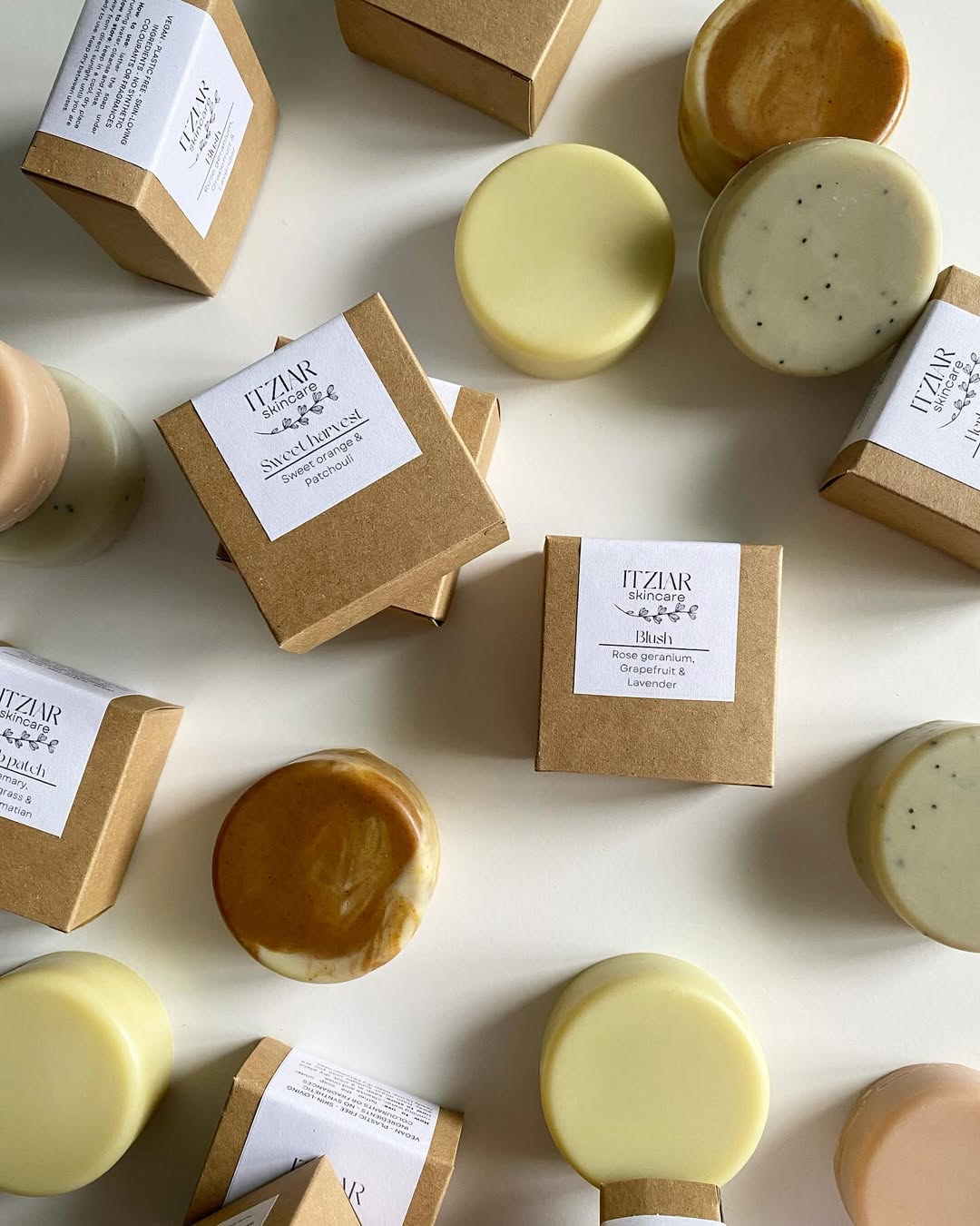Round soaps and kraft boxes give this setup a charming, handmade feel—but it’s the subtle label design that keeps it polished. White stickers with delicate fonts let the natural color and texture of each bar take the lead. Ideal for a brand that wants to feel organic without losing its edge.