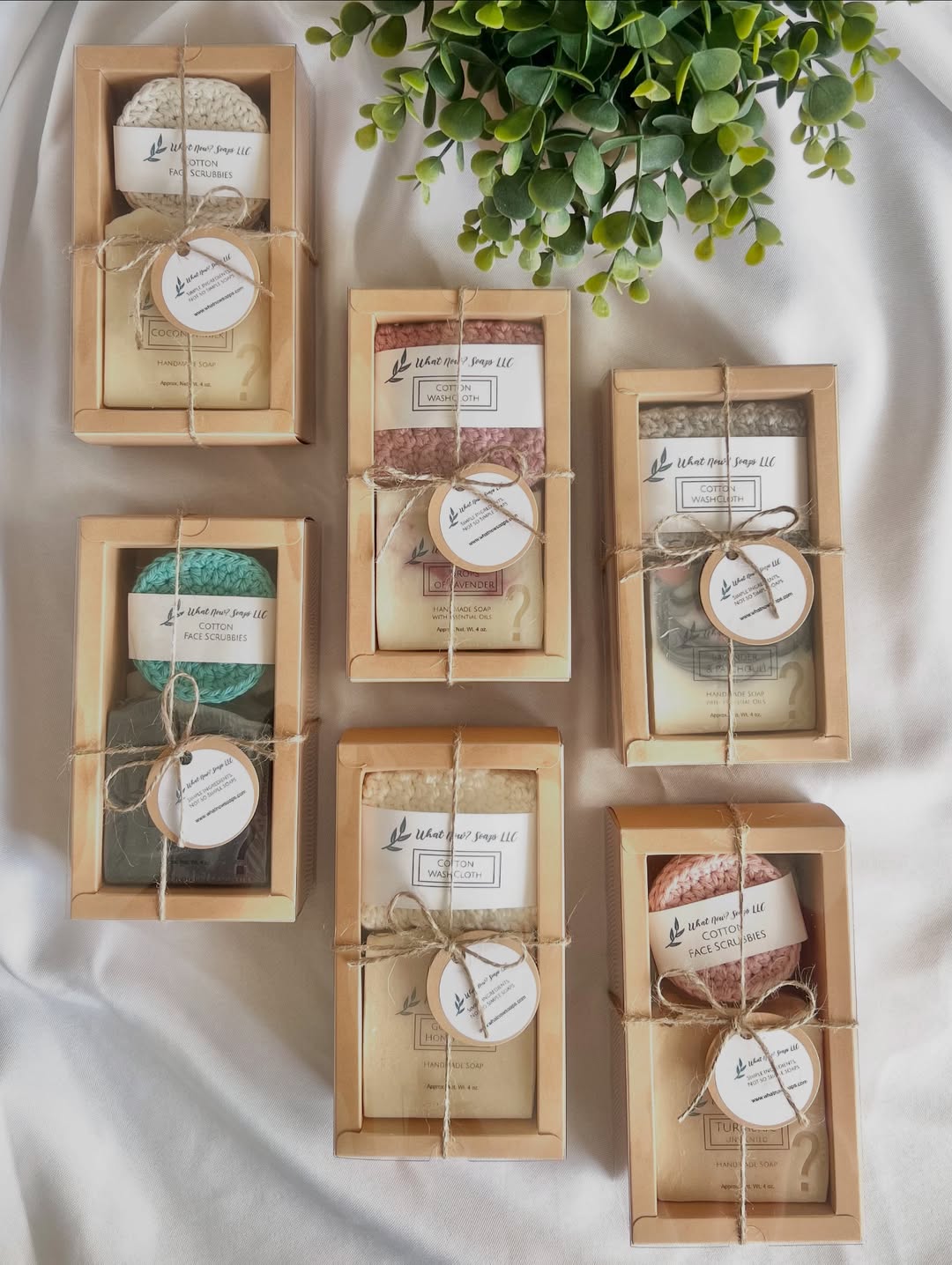 Each set feels like a tiny care package, tied with twine and full of slow-living charm. The kraft paper boxes show off handmade soaps and textured cotton cloths through clear windows—no surprises, just cozy goodness. Muted tones and natural fibers say “thoughtful gift” without even trying. It’s giving homestead chic, one scrub at a time.