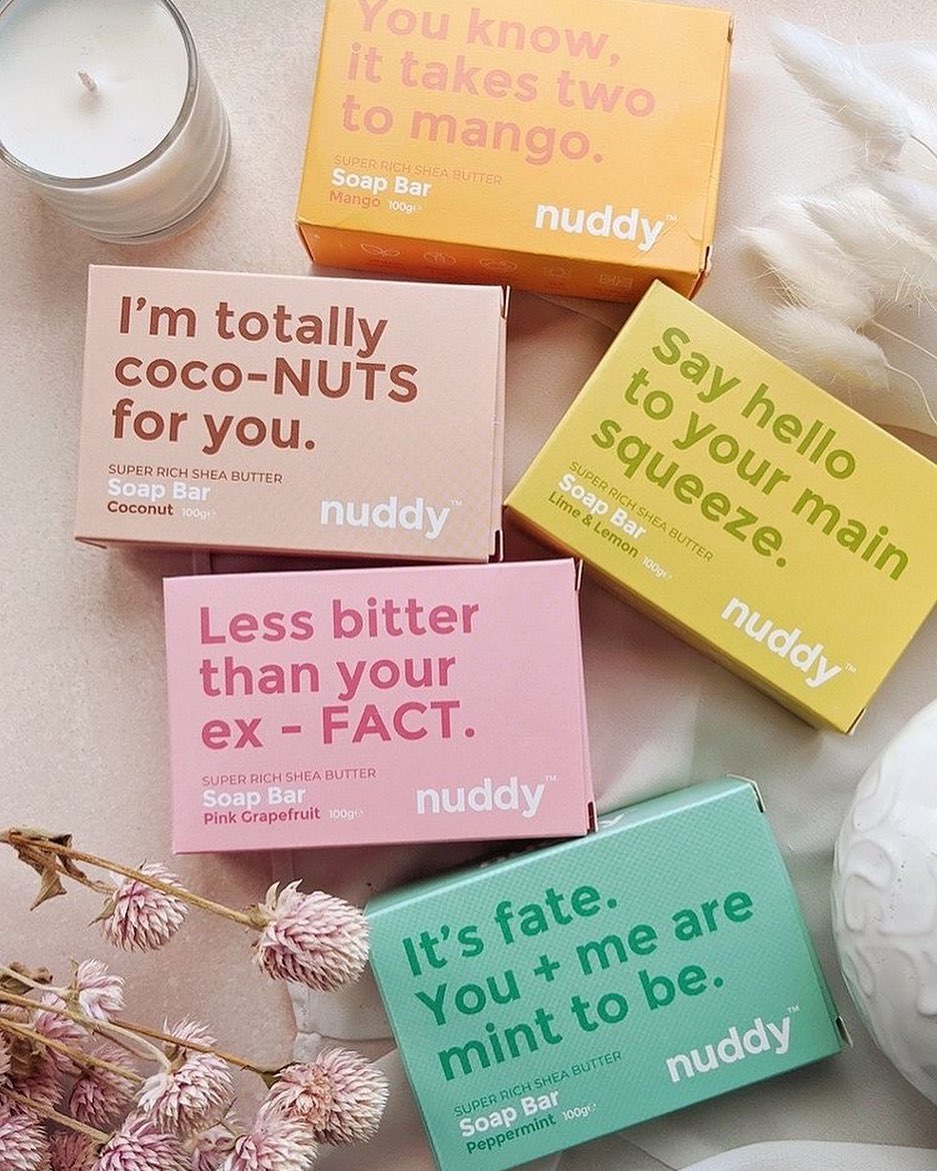 Bright blocks of color and bold type do all the talking—literally. Each box drops a playful pun or cheeky phrase that doubles as shelf appeal and mood booster. Minimal design, maximum personality. You might buy it for the joke, but you’ll come back for the scent.