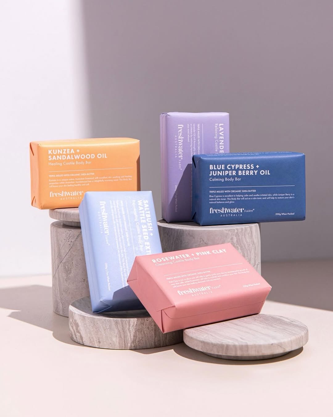 Matte pastels and all-caps ingredients create a wellness-lab aesthetic that’s soft yet scientific. Thoughtful spacing and sans serif fonts keep things clean and highly legible, while the angled product stack shows off each bar like it’s on a skincare runway. The look is modern apothecary—Instagram-ready but rooted in function.