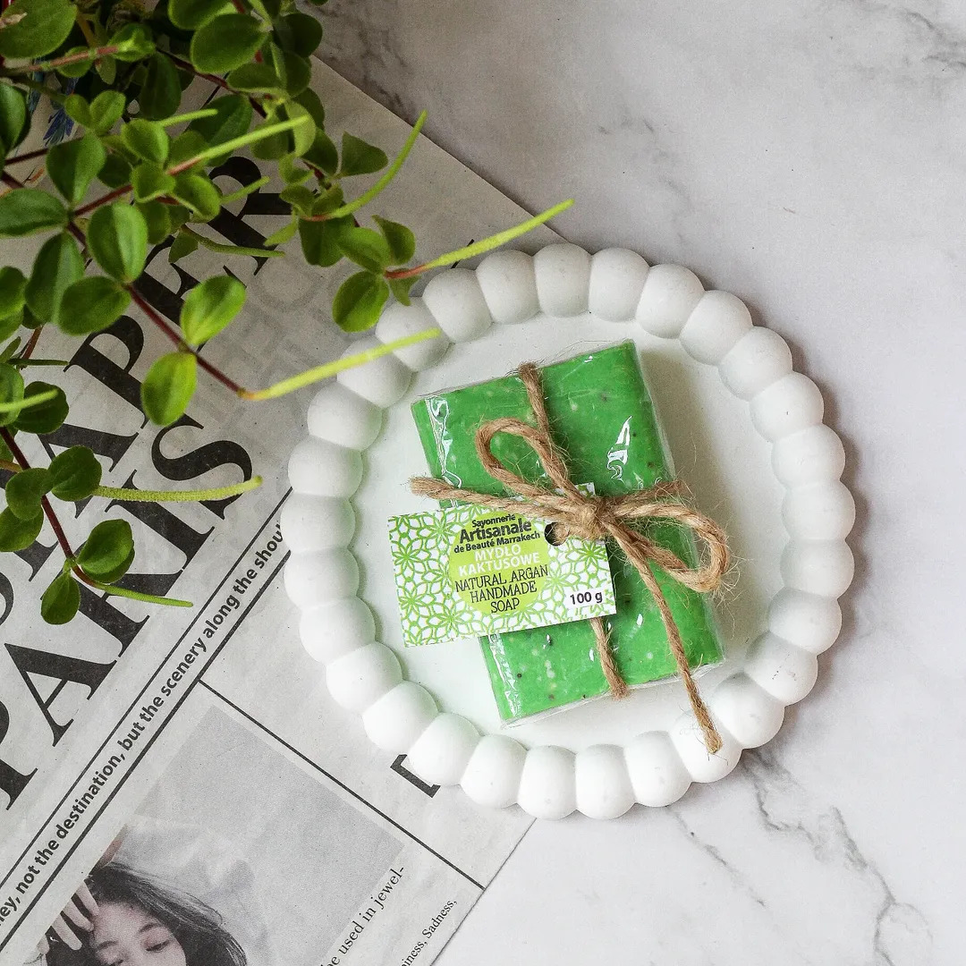 This soap goes bold with its vibrant green wrap and glossy finish, instantly catching the eye. A rough twine bow adds that handmade touch, keeping it from feeling too polished. The patterned tag leans Moroccan-inspired, hinting at the argan oil inside. It’s a little luxe, a little rustic—like market day meets skincare ritual.