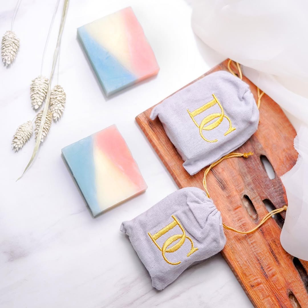 Diagonal bands of peach, ivory, and sky blue turn each bar into a soft color story. The linen pouches, stitched with golden monograms, feel like part of a high-end skincare ritual. Simple, minimal, and ultra-giftable—nothing extra, just elegant details that speak volumes.