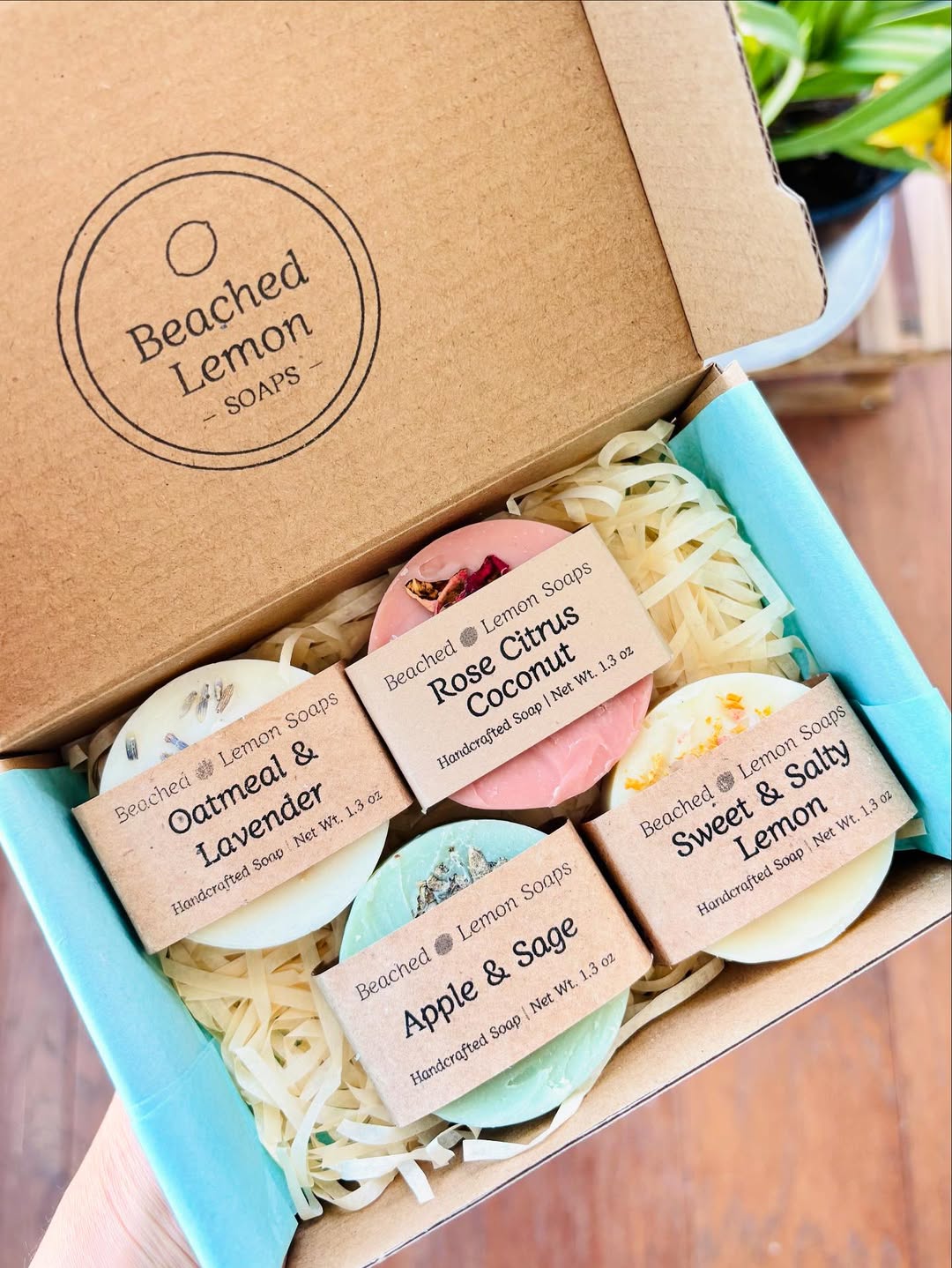 Bright, beachy, and boxed to delight—each soap puck comes wrapped in kraft paper with typewriter-style labels that feel both nostalgic and handmade. Crinkle paper and pastel tissue keep it breezy and gift-ready. Between the playful names and juicy color palette, it’s like a farmers market for your senses.