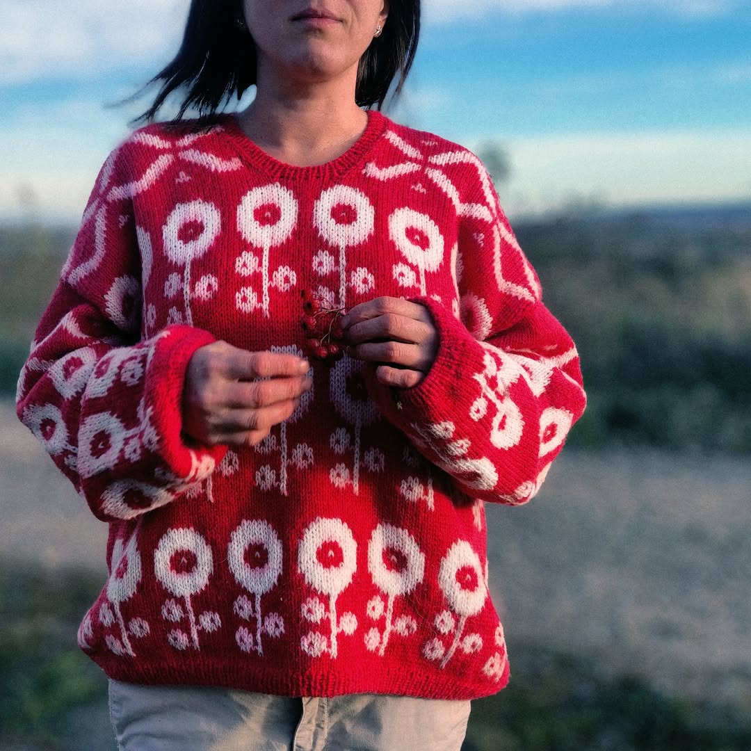 Cherry red yarn sets a vibrant, eye-catching base that feels instantly cheerful. Cream floral motifs bring a folk-inspired pattern that reads both vintage and playful. The relaxed fit gives it that easy, throw-on appeal for everyday wear. This is the kind of standout knit Etsy shoppers love for spring statement pieces.