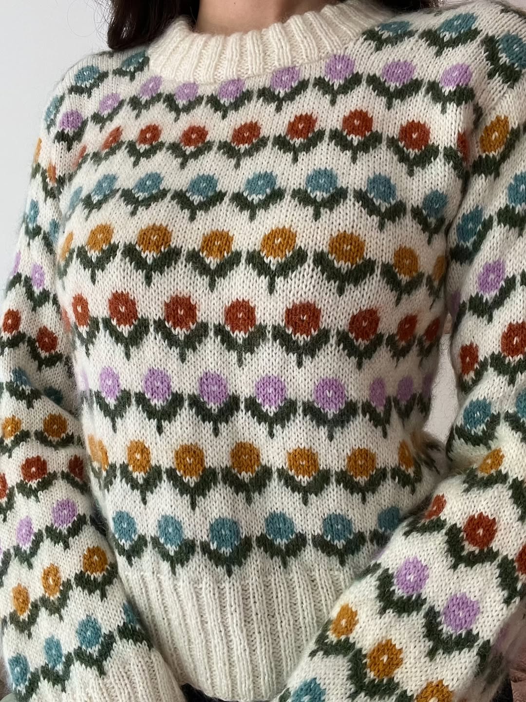 Creamy yarn creates a calm base that lets the tiny floral rows shine. Each stripe brings a new muted color, giving it a gentle, meadow-like rhythm. The repeating pattern feels tidy but still playful. This is the kind of cozy knit Etsy shoppers love for easy, everyday spring wear.