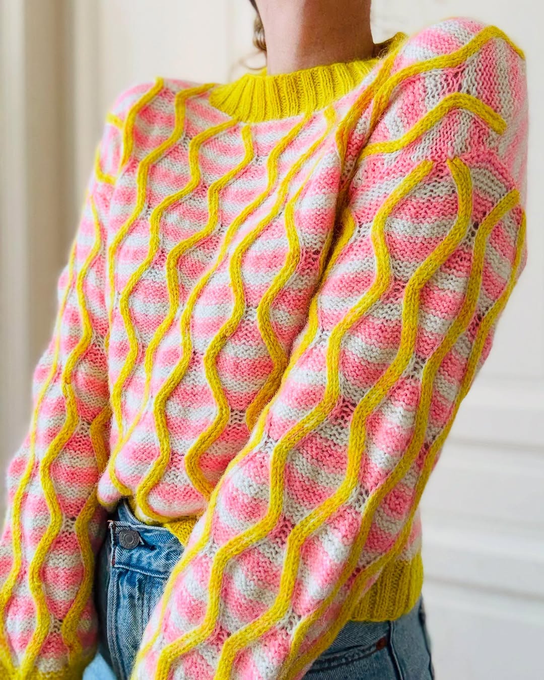 Pink and mint stripes set a sweet, almost confectionery base. Raised yellow wavy lines add texture and a punchy, unexpected contrast. The ribbed cuffs and collar bring in a clean, sporty finish. This is the kind of bold, tactile knit that instantly stands out on Etsy scrolls.