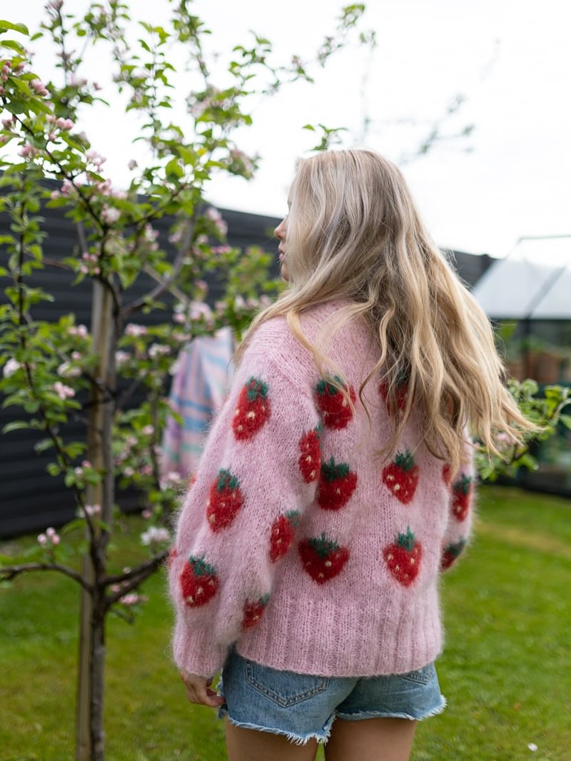 Fluffy pink yarn sets a soft, romantic base that feels perfectly spring-ready. The scattered strawberry motifs add a playful, almost storybook charm. The slightly oversized fit keeps it relaxed and easy to style. This is the kind of whimsical knit Etsy shoppers can’t resist for sunny-day outfits.
