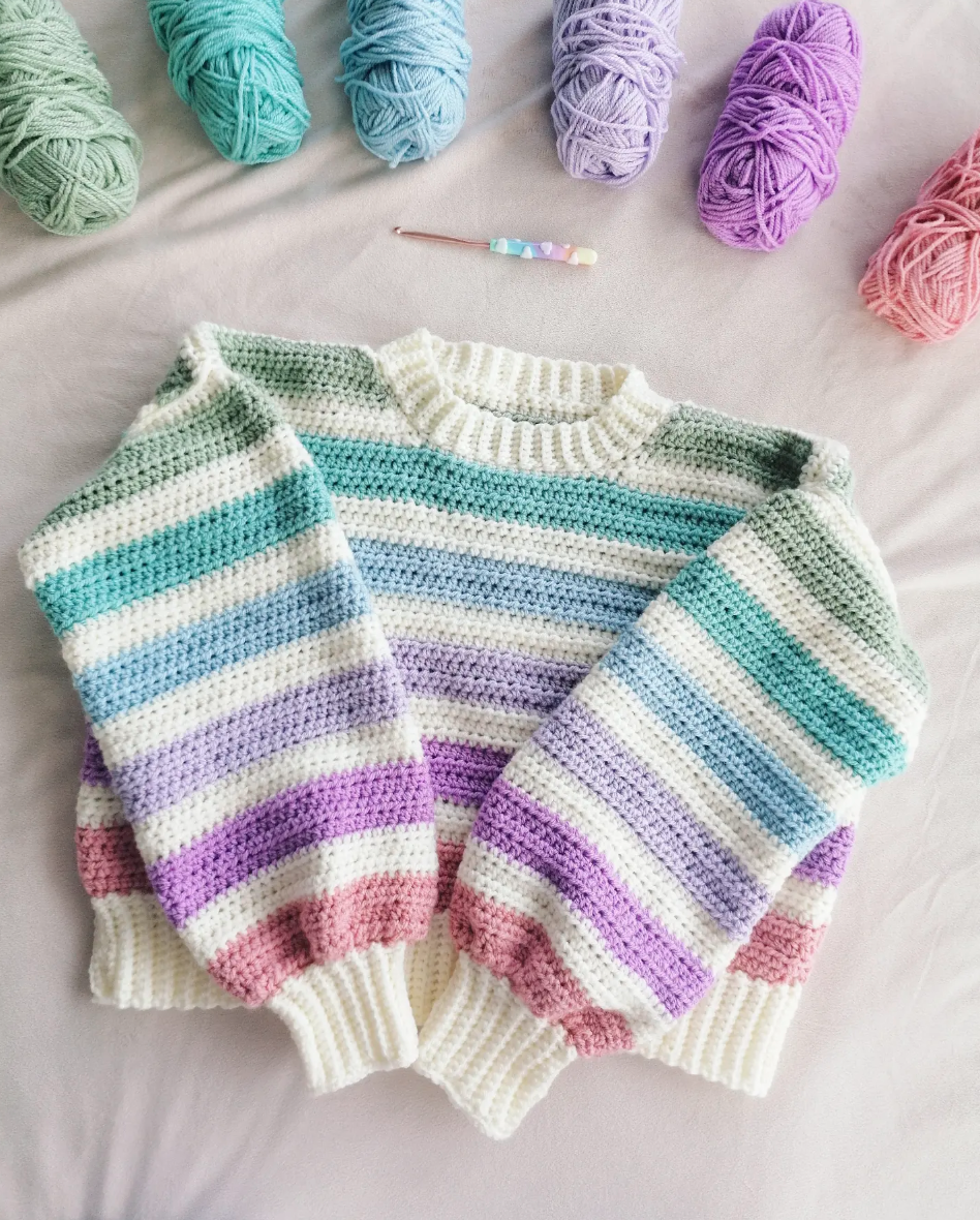 Mint, lilac, blush, and sky blue stripes create a calm, candy-soft palette. The chunky crochet texture adds a handmade feel that Etsy shoppers love. Wide ribbed cuffs and hem keep the shape structured and cozy. This is the kind of easygoing knit that sells as a perfect beginner-friendly pattern.