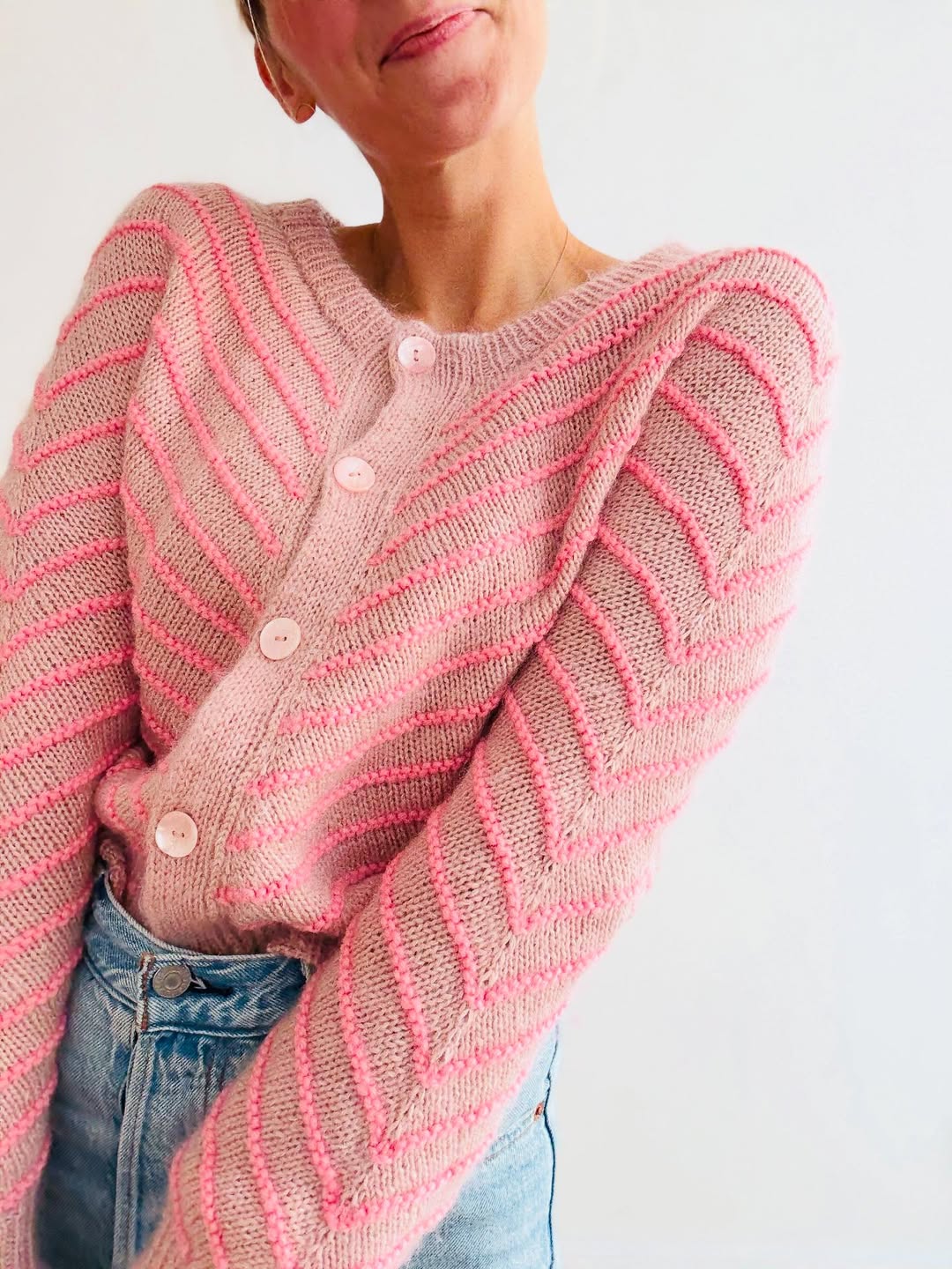 Soft beige yarn sets a warm, neutral foundation. Raised pink chevron lines add texture and a gentle hit of color. The button-front detail keeps it classic and easy to style. This is the kind of polished knit Etsy shoppers love for elevated everyday looks.