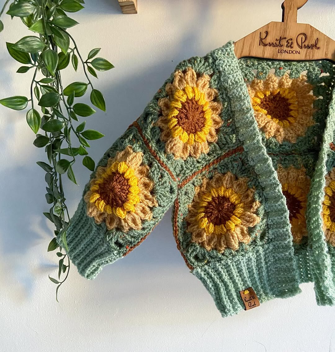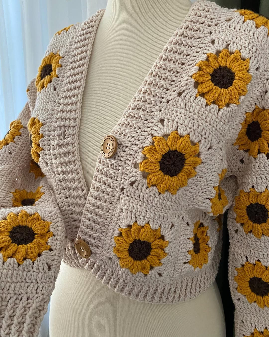 Neutral beige yarn keeps the base calm and easy to style. The chunky sunflower granny squares bring bold texture and warm, golden color. Wooden buttons add a natural, slightly rustic finish. This is the kind of cheerful handmade knit Etsy shoppers love for sunny spring days.