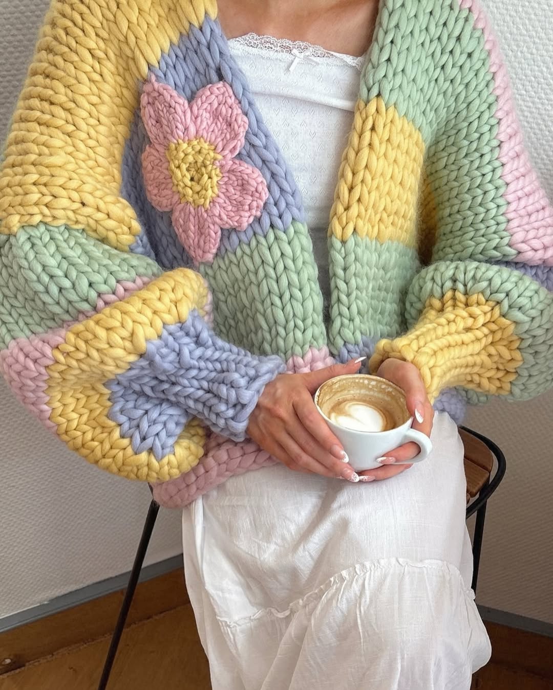 Super chunky yarn makes this piece instantly eye-catching and ultra tactile. Blocks of mint, butter yellow, lavender, and blush create a soft, playful palette. The oversized flower detail adds a bold, handmade focal point. This is the kind of statement knit Etsy shoppers love for standout, cozy spring pieces.