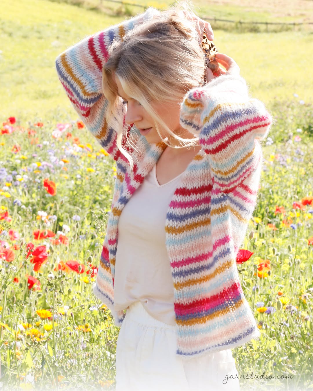 Lightweight yarn and soft rainbow stripes feel right at home in a blooming field. The airy knit keeps it breezy and perfect for layering over simple basics. Slightly flared sleeves add a relaxed, carefree touch. This is the kind of feel-good knit Etsy shoppers picture for spring outings.
