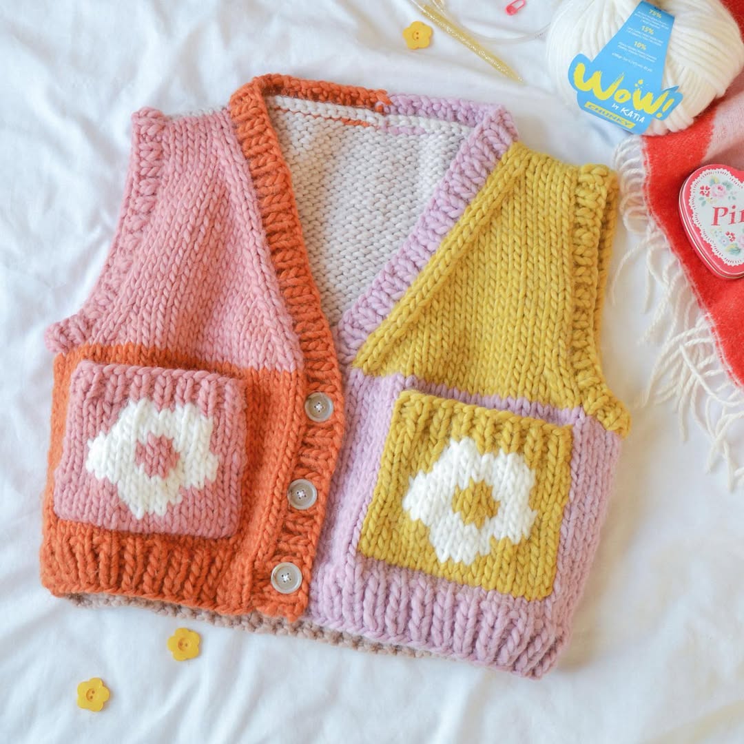 Peach, butter yellow, and blush tones create a cheerful patchwork feel. The contrasting trims give each section a crisp, defined edge. Two front pockets with daisy motifs add a cute, functional detail. This is the kind of quirky knit Etsy shoppers love for standout handmade pieces.