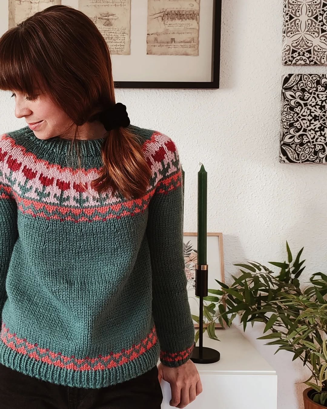 Deep green yarn sets a rich, grounded base for the design. The yoke pattern brings in warm reds and soft neutrals with a classic Nordic feel. Clean ribbing keeps the silhouette neat and wearable. This is the kind of timeless knit Etsy shoppers reach for during cooler spring days.