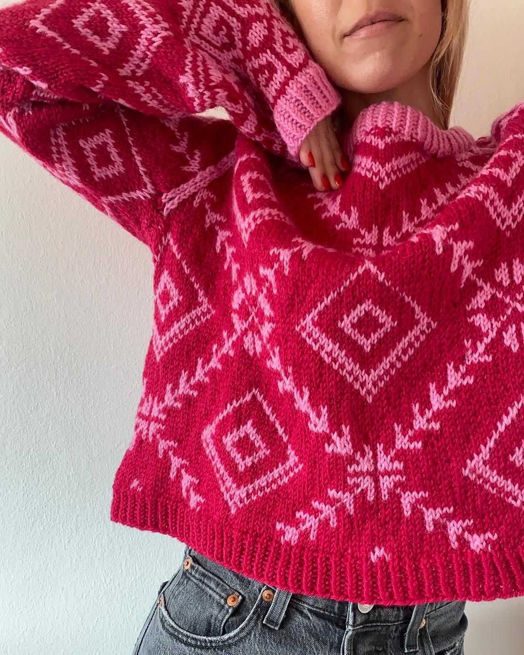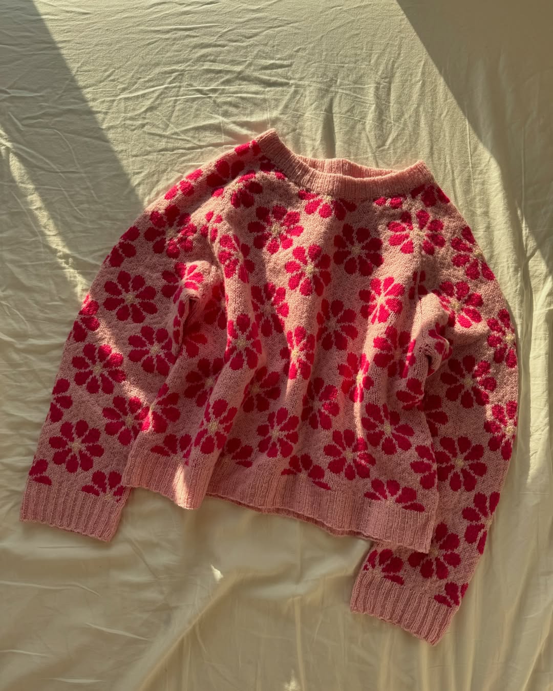 Soft blush pink sets a playful base that instantly reads spring-ready. The bold red floral motifs bring a punchy, almost retro graphic vibe. Dropped shoulders and a relaxed fit keep it casual and easy to wear. This is the kind of knit that turns simple outfits into Etsy-worthy statements.