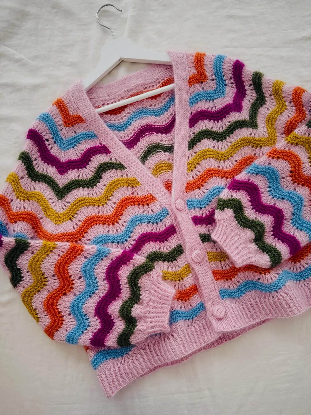 Candy-colored zigzag stripes turn this cardigan into a full mood. The soft pink base keeps the palette grounded instead of chaotic. Balloon sleeves add volume and a cozy, slightly dramatic shape. This is the kind of playful knit Etsy shoppers grab for standout spring layering.