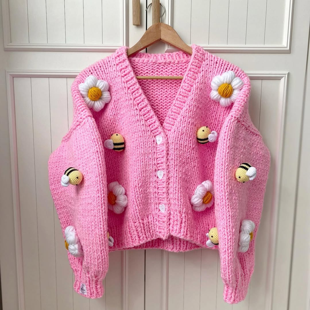 Chunky pink yarn sets a playful, almost candy-like tone. The 3D daisies and tiny bees add texture that instantly grabs attention. Slightly oversized sleeves keep the silhouette cozy and giftable. This is the kind of whimsical knit that flies off Etsy shelves in spring.