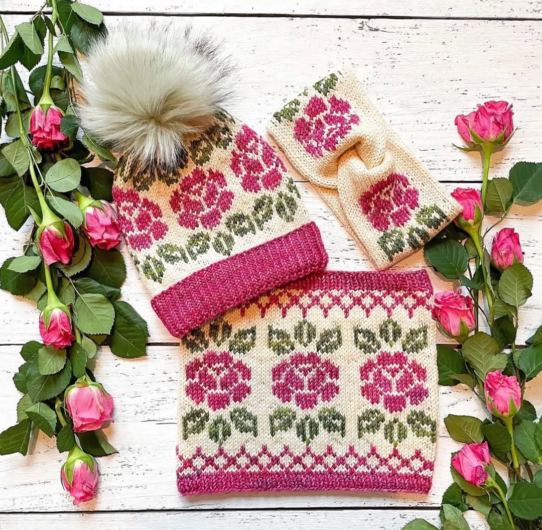 Creamy yarn softens the palette and lets the rose motifs shine. The matching hat, cowl, and headband create a ready-to-sell coordinated set. A fluffy pom-pom adds a cozy, giftable finish. This is the kind of charming knit bundle Etsy shoppers scoop up for spring gifting.