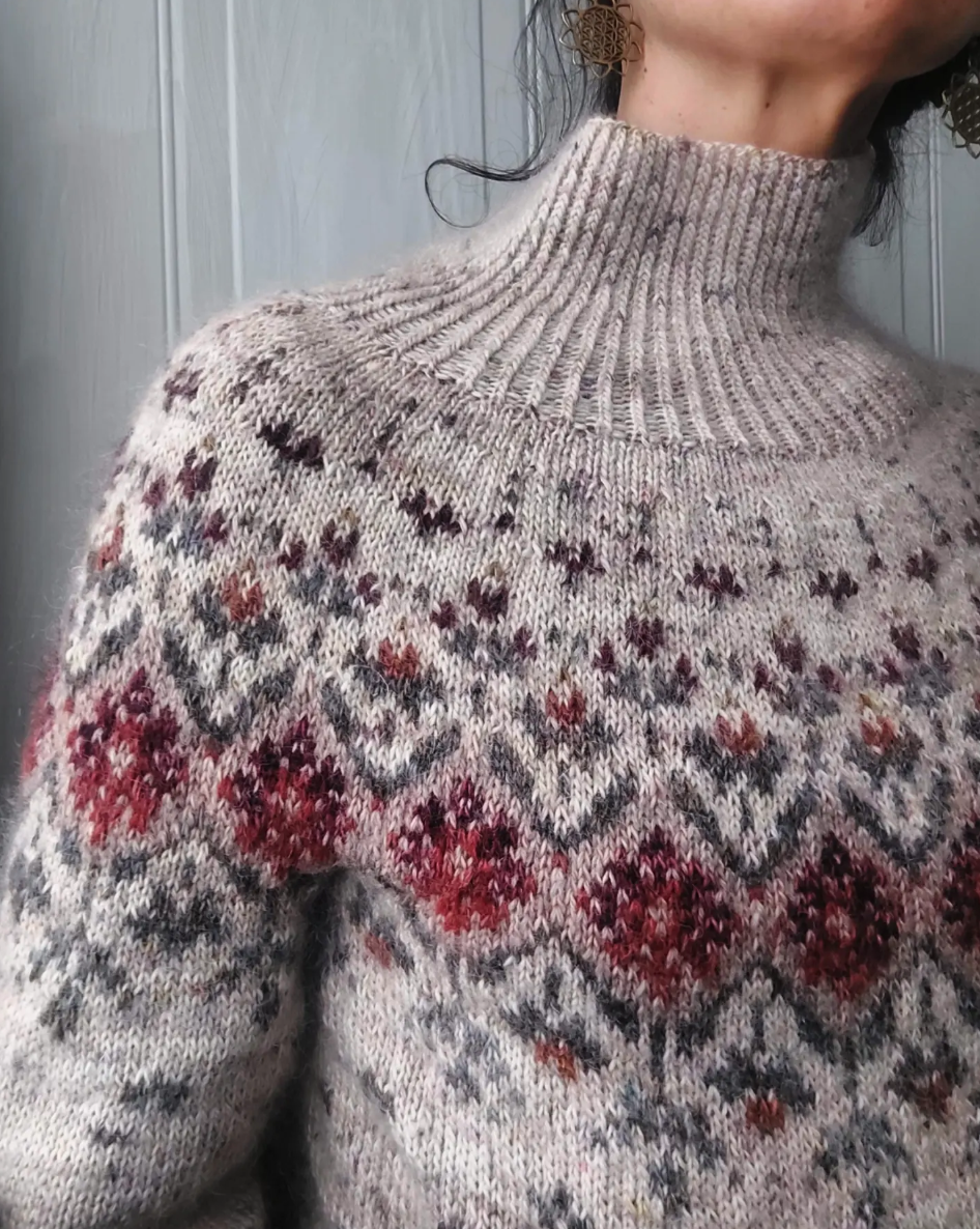 Soft heathered yarn gives this sweater a worn-in, heritage feel. The intricate floral yoke pattern adds depth with muted reds and earthy tones. A high ribbed neckline brings structure and a cozy finish. This is the kind of timeless knit Etsy shoppers love for slow, thoughtful wardrobes.