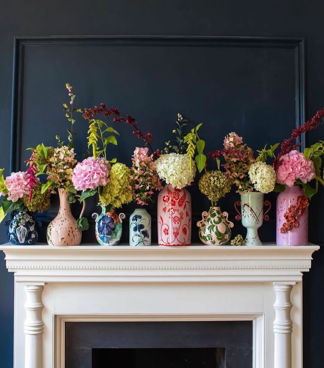 A lineup of hand-painted vases turns this mantel into a full-on color story. Each vessel brings its own personality through florals, scrollwork, and saturated glaze. Lush hydrangeas and garden stems create height that dances against the inky blue wall. The trick is repetition in shape, not color, so the mix feels curated instead of chaotic.